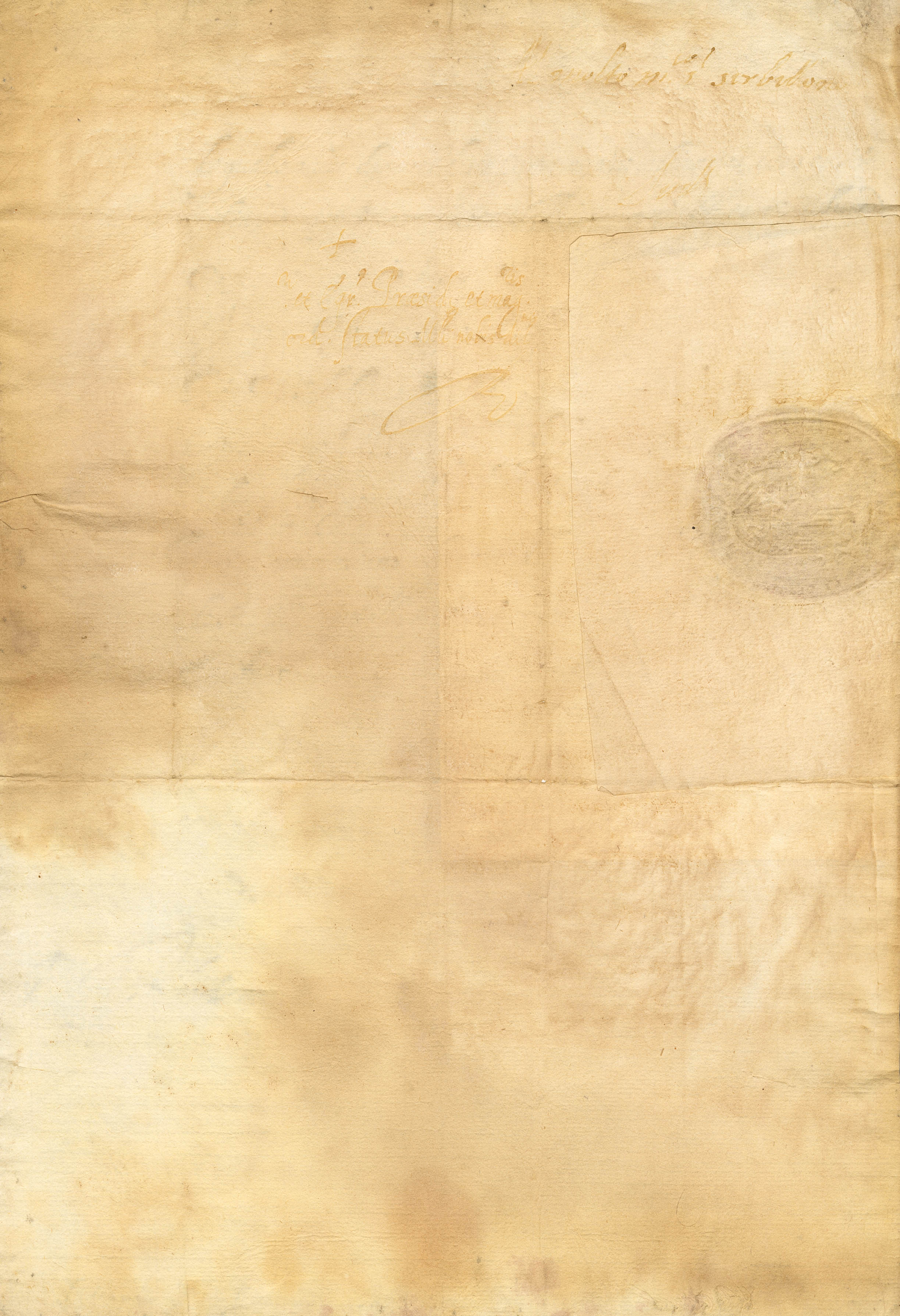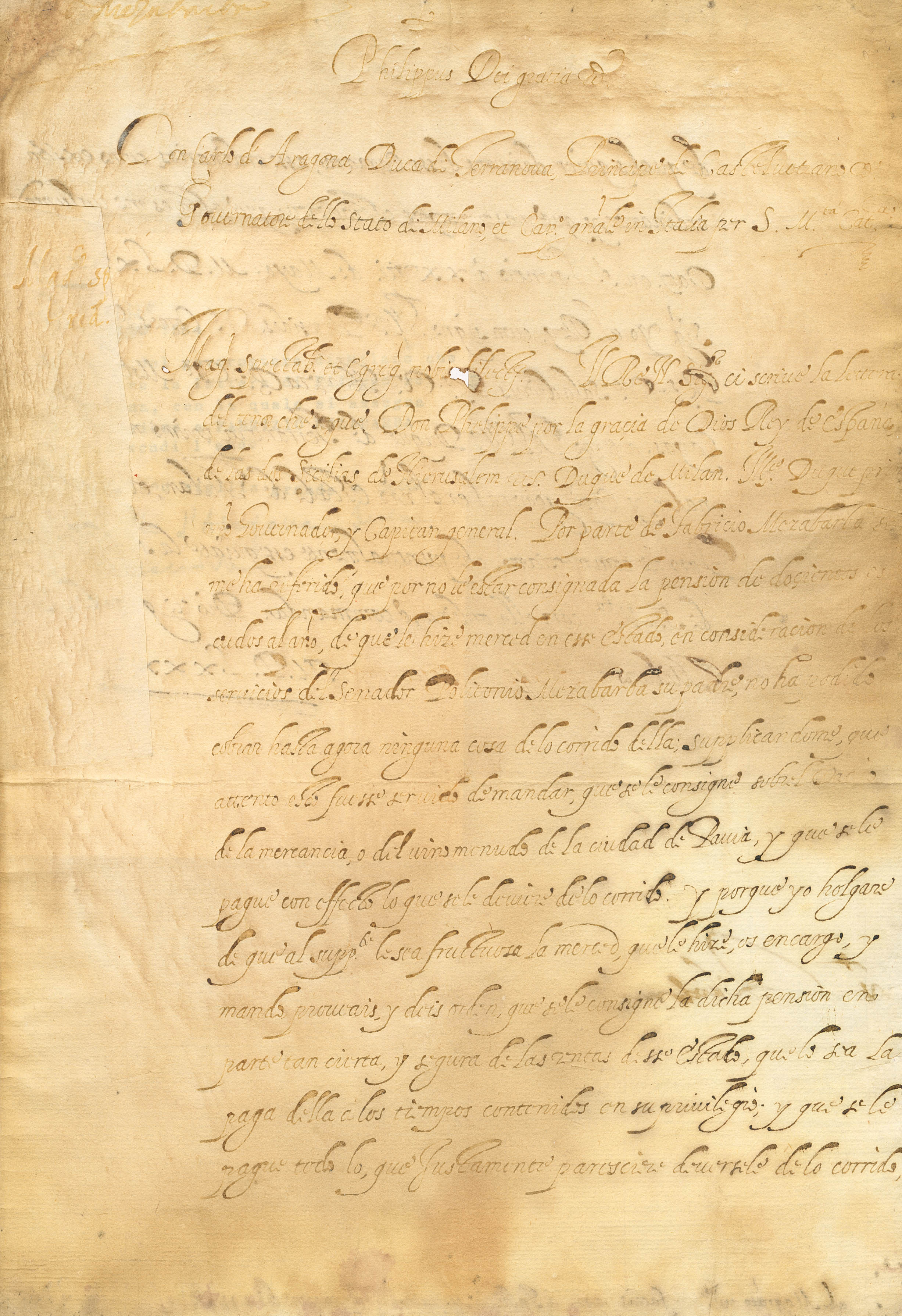 1584. Carta remitida por Don Carlos de Aragón y Tagliavia, Duque de Terranova transcribiendo texto del Rey Felipe II respecto a una pensión de Don Fabrizio Mezzabarba, hijo de un senador de MILAN (dirección del destinatario debilitada y sello del Gobernador de Milán en seco). BONITA Y RARA.