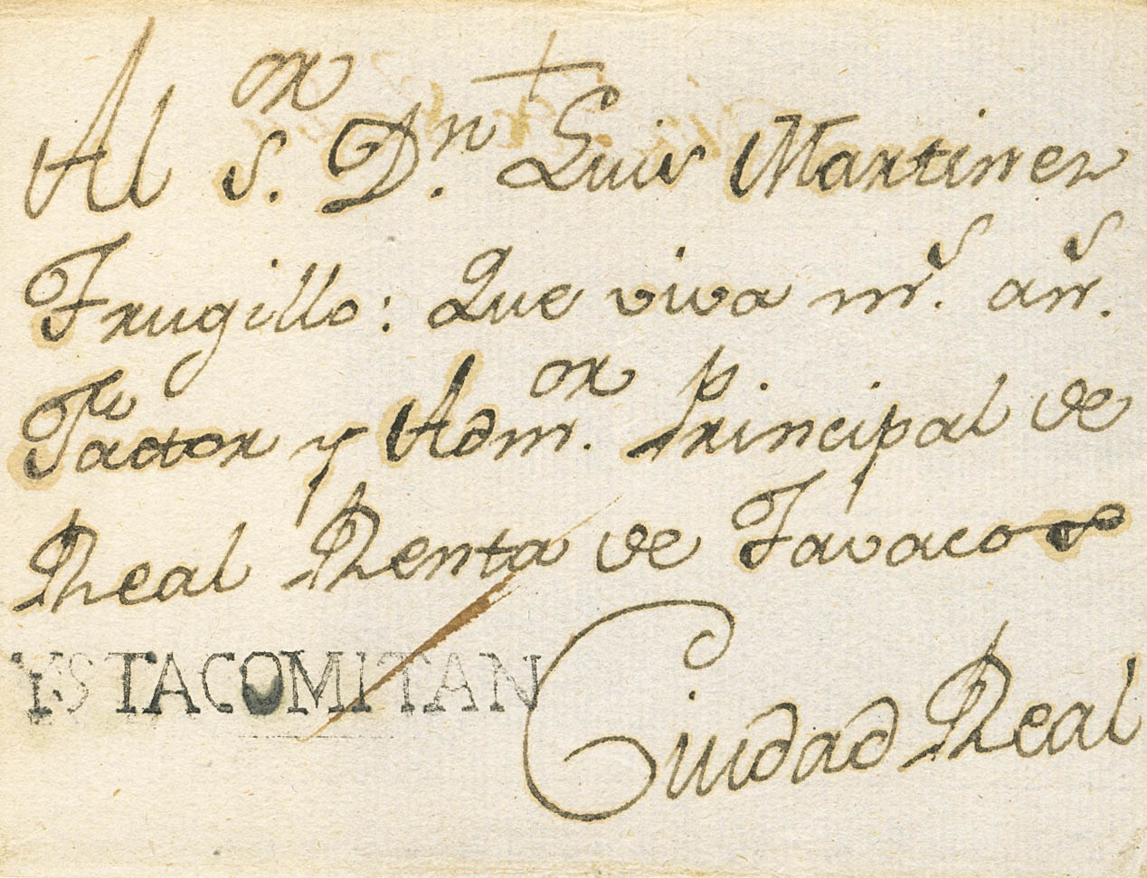 1802. Frontal de YSTACOMITAN (REINO DE GUATEMALA) a CIUDAD REAL. Marca YSTACOMITAN, en negro (P.E.1) edición 2004. MAGNIFICO Y RARISIMO.