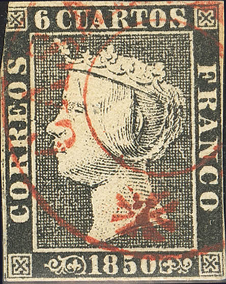 1. 1850. 6 cuartos negro (margen izquierdo justo). Matasello préfilatelico CASALAREYNA, en rojo. MAGNIFICO Y RARO. Cert. COMEX.