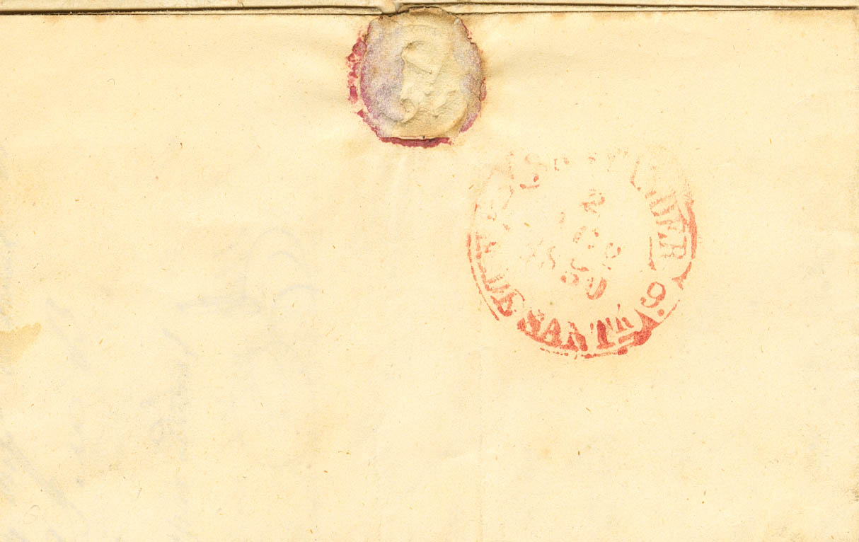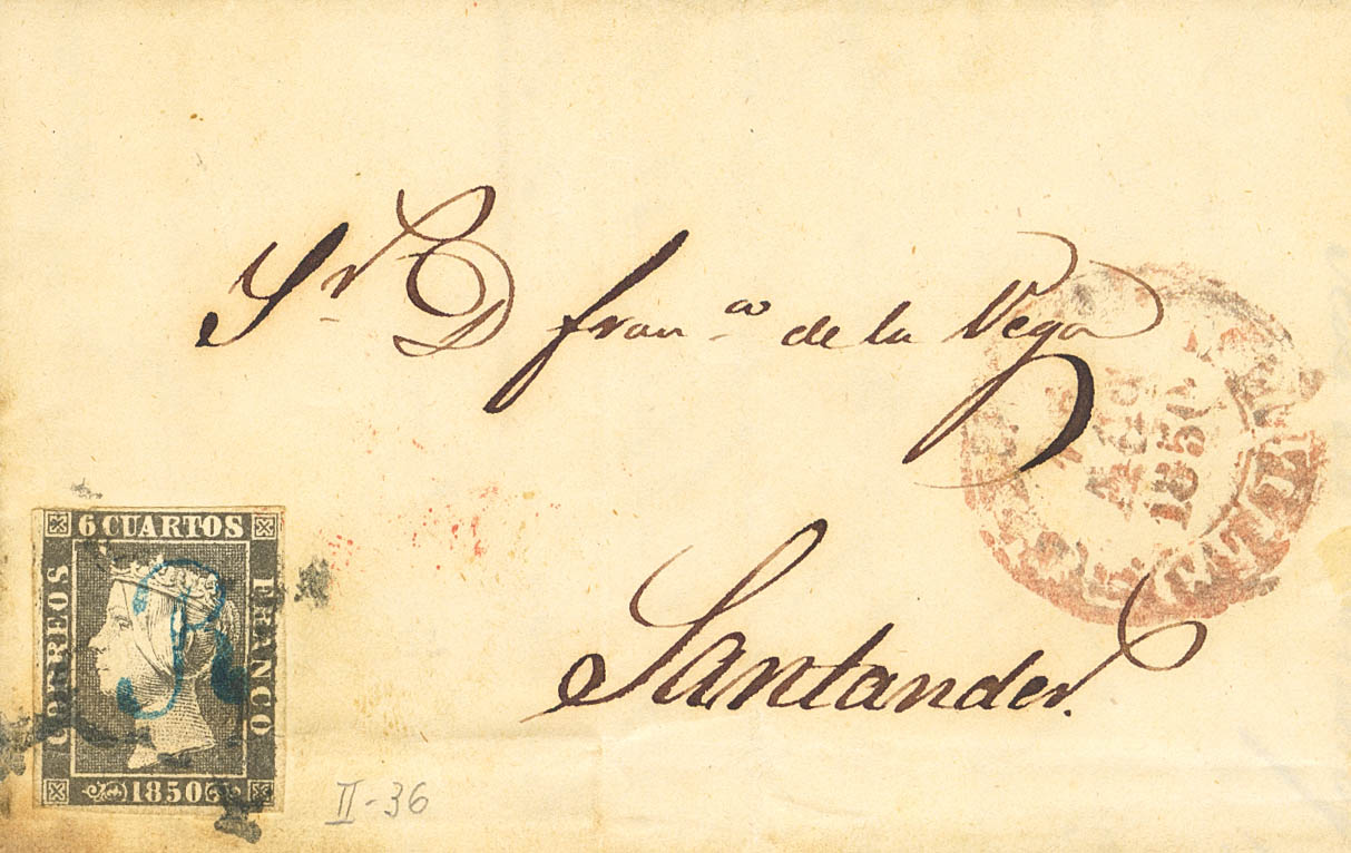 1A. 1850. 6 cuartos negro. BARCELONA a SANTANDER. Matasello mixto "R", en azul de Barcelona y ARAÑA, en negro . MAGNIFICA Y RARA. Cert. CEM.