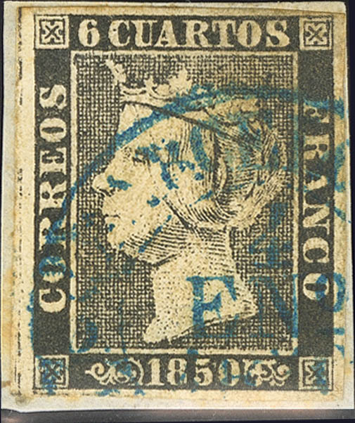 1. 1850. 6 cuartos negro (I-1). Matasello BARCELONA / 4-ENº-1850 / CATALUÑA, en azul. MAGNIFICO Y RARISIMO. Cert. GRAUS.