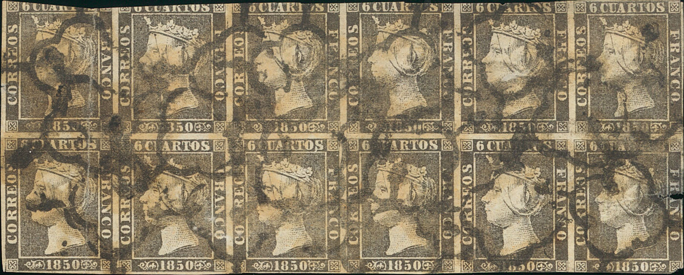 1A(12). 1850. 6 cuartos negro, bloque de doce (defectitos habituales en bloques de este tamaño). BONITO Y RARO. Cert. GRAUS. Edifil 2020: +++2.025 Euros