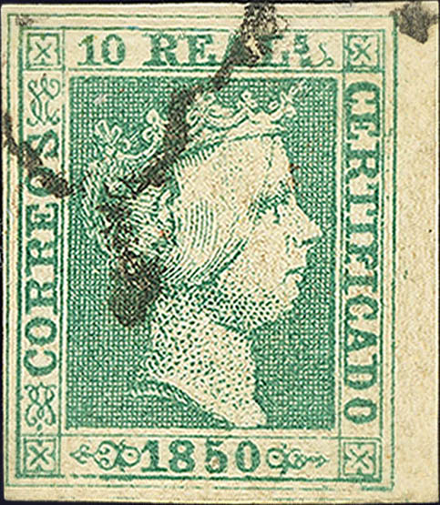 5. 1850. 10 reales verde, borde de hoja (inapreciable reparación en el margen superior). MAGNIFICO Y ESPECTACULAR.