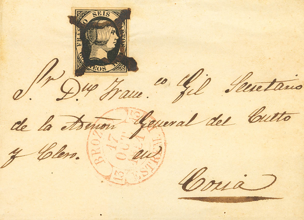 6. 1851. 6 cuartos negro. BROZAS (CACERES) a CORIA. MAGNIFICA.