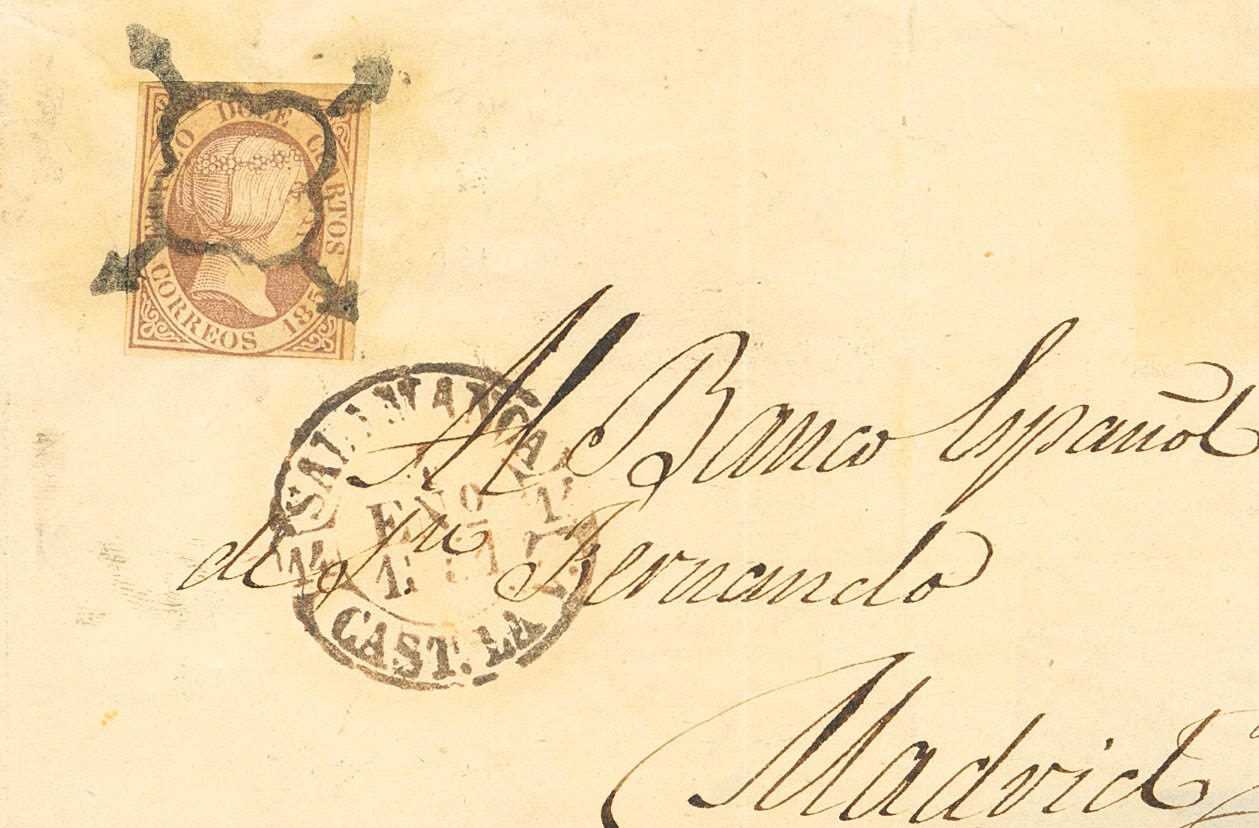 7. 1851. 12 cuartos lila. SALAMANCA a MADRID. MAGNIFICA Y ESPECTACULAR DOBLE PORTE.