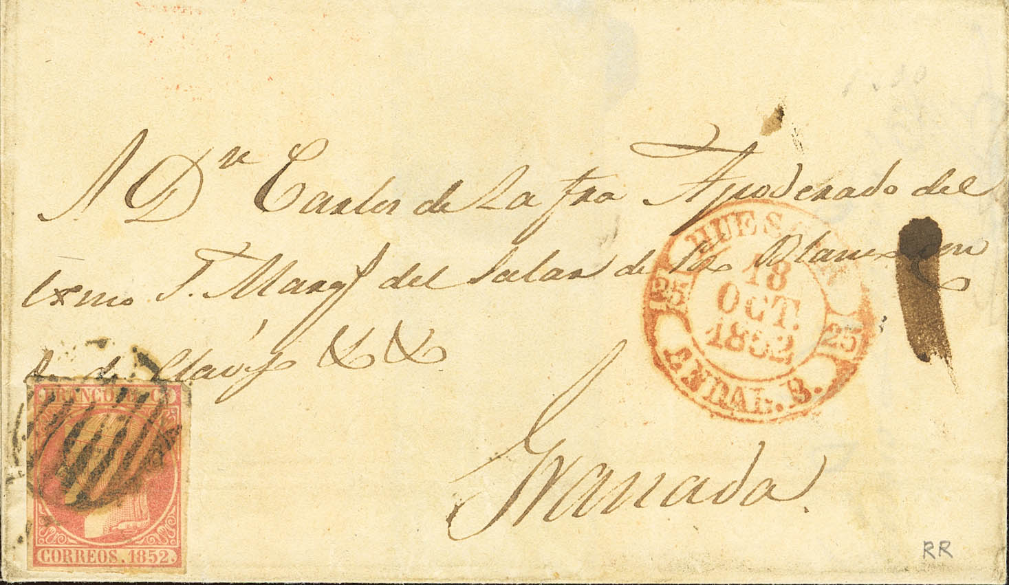 12. 1852. 6 cuartos rosa. HUESCAR (GRANADA) a GRANADA. MAGNIFICA Y MUY RARA.