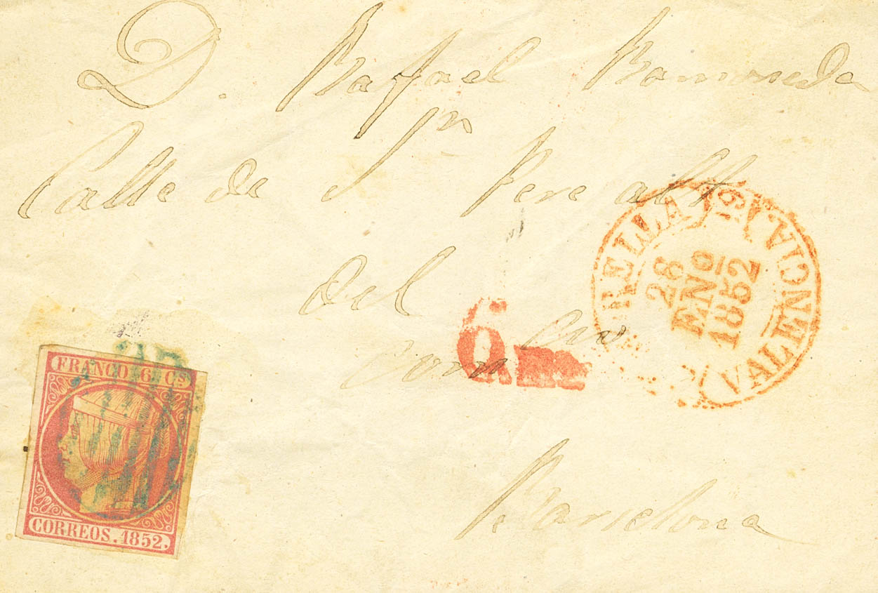 12. 1852. (26 de Enero). 6 cuartos rosa. MORELLA (CASTELLON) a BARCELONA. Matasello PARRILLA, en azul. MAGNIFICA.