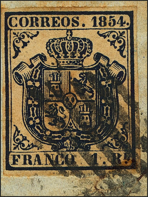 △ 34. 1854. 1 real azul, sobre fragmento. MAGNIFICO.