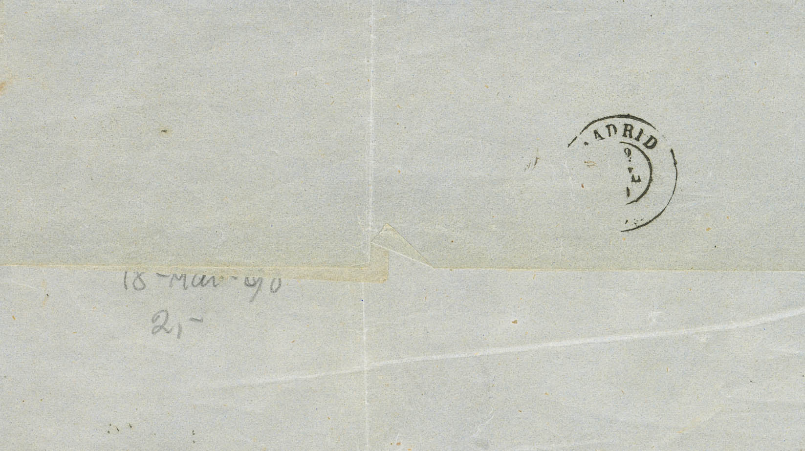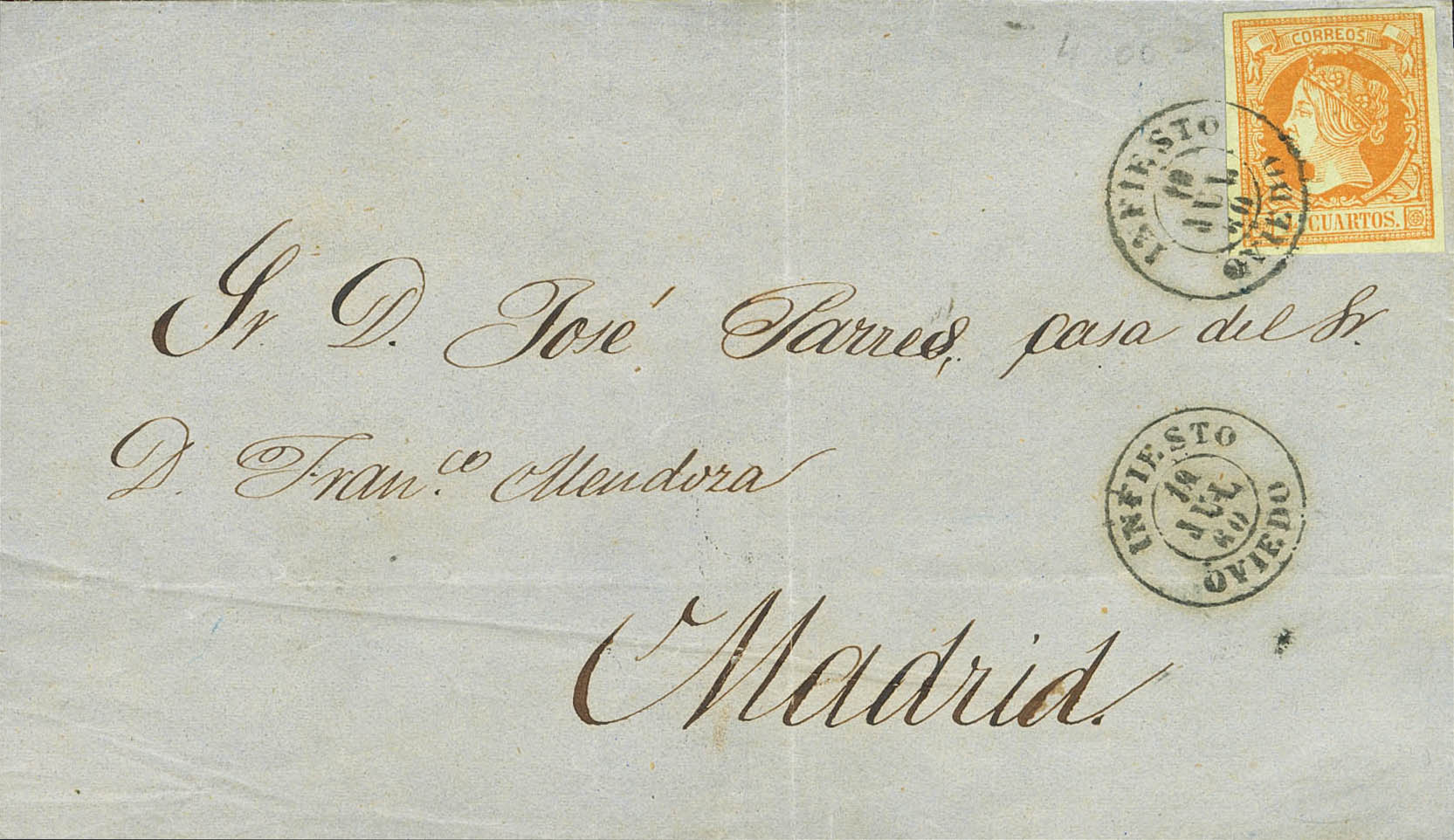 52. 1860. 4 cuartos amarillo. INFIESTO a MADRID. Matasello INFIESTO / OVIEDO. MAGNIFICA Y RARA.