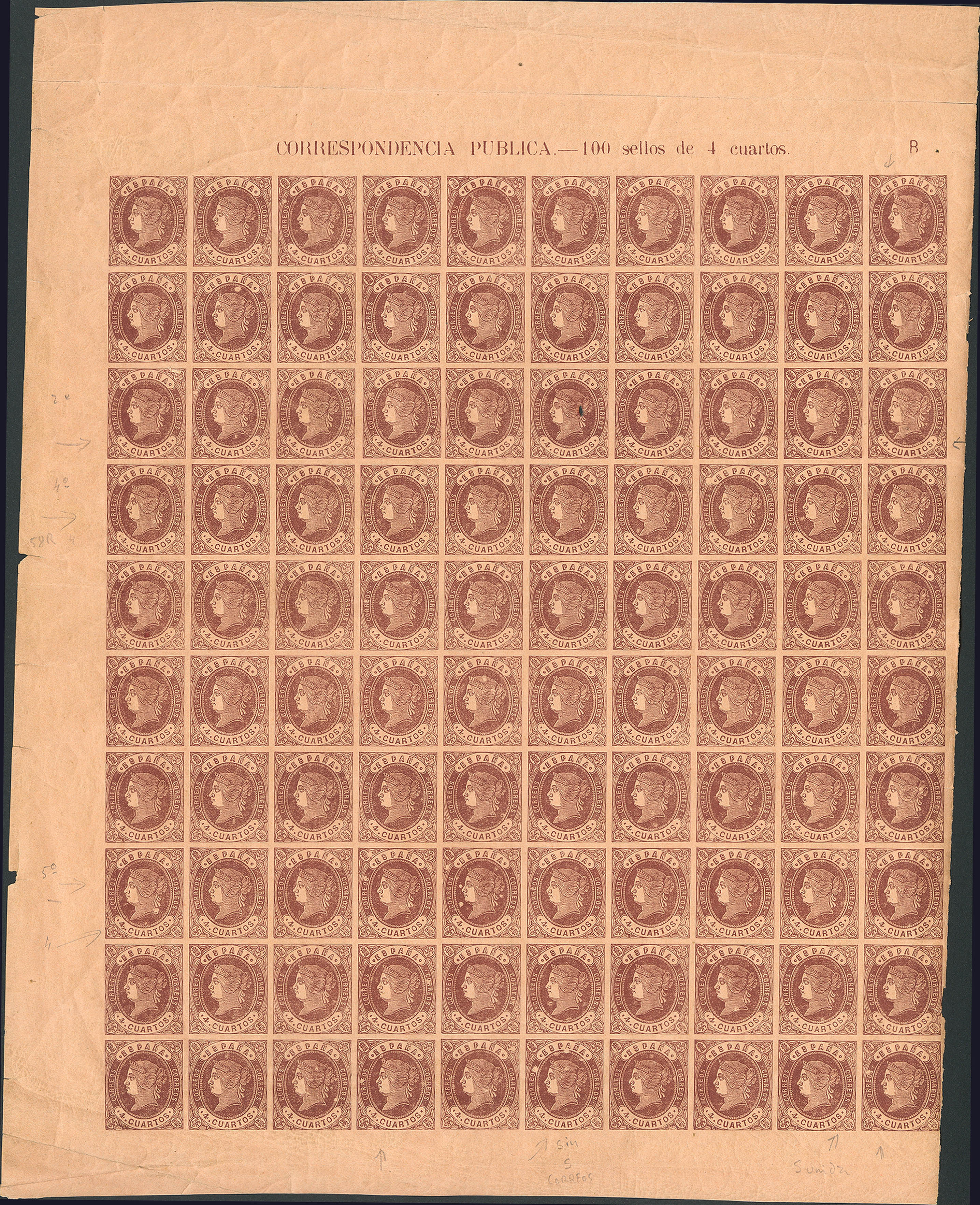 ★★ 58(100). 1862. 4 cuartos castaño, pliego de cien sellos (conservación habitual en piezas de este tamaño). MAGNIFICO Y RARO.