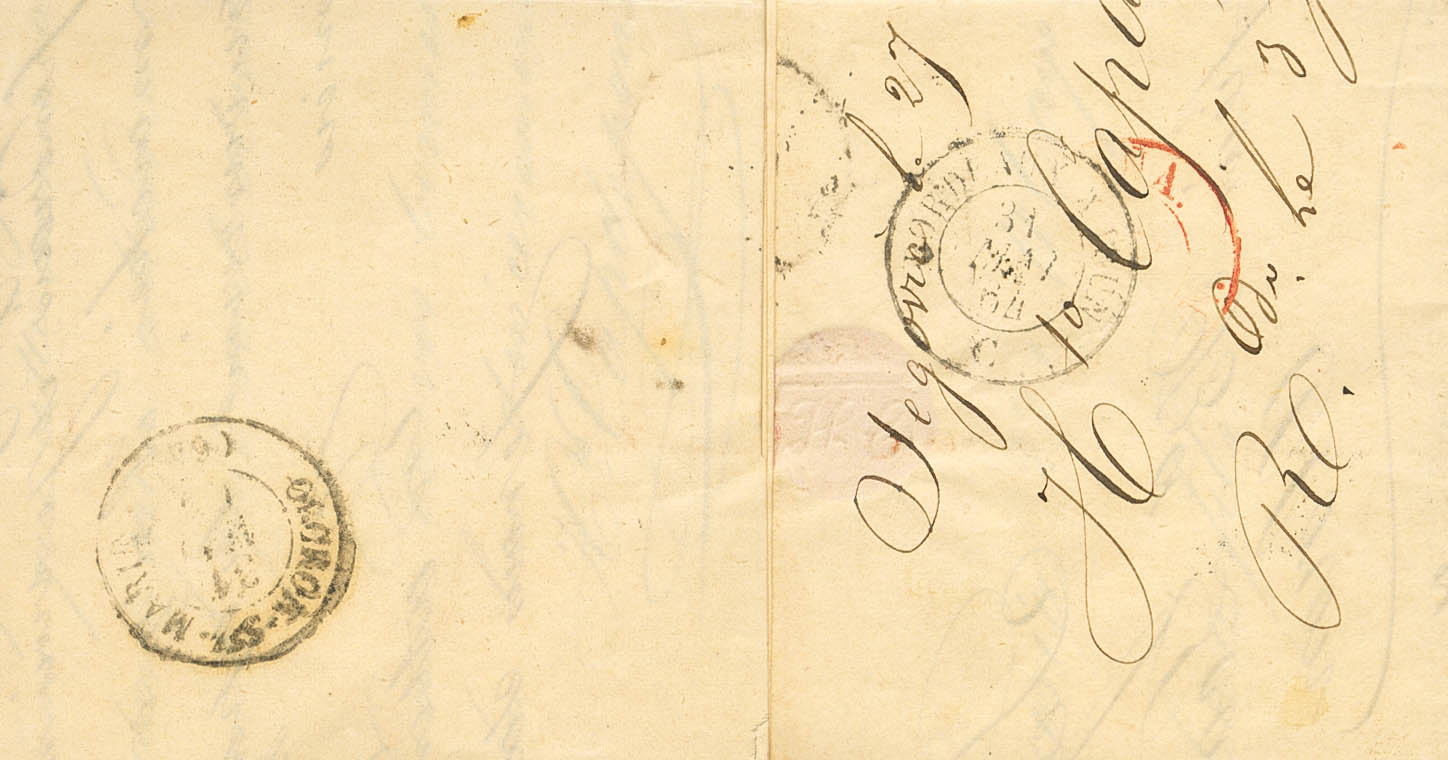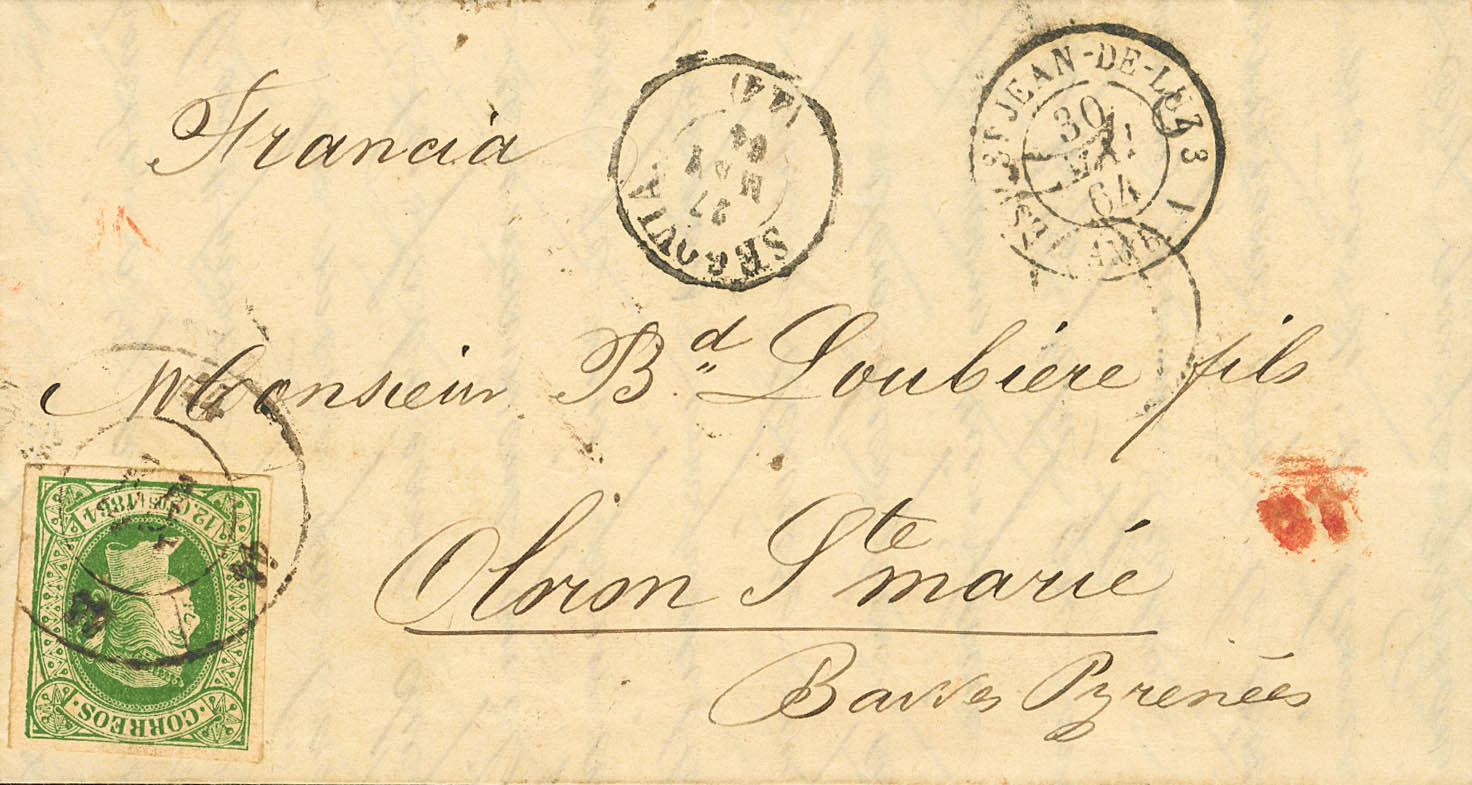 65. 1864. 12 cuartos verde. SEGOVIA a OLORON (FRANCIA). Matasello R.CARRETA Nº44. MAGNIFICA.