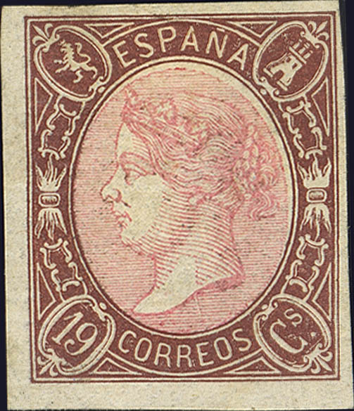 ★ 71. 1865. 19 cuartos castaño y rosa (margen superior izquierdo justo sin tocar el dibujo). MAGNIFICO. Cert. CEM.
