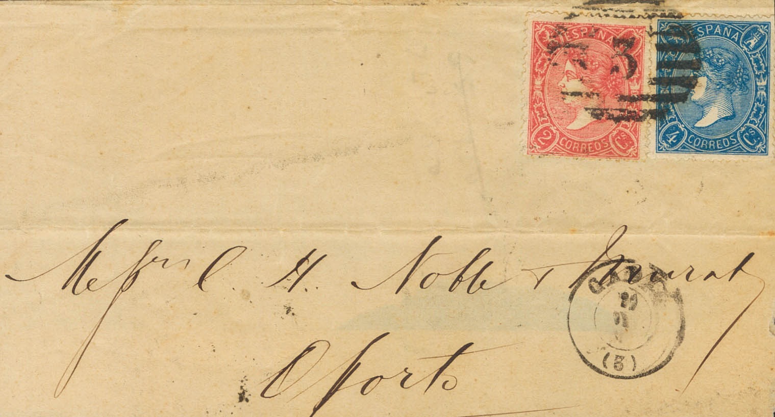 74, 75. 1865. 2 cuartos rosa rojo y 4 cuartos azul. CADIZ a OPORTO (PORTUGAL). Matasello PARRILLA Nº3, de Cádiz. MAGNIFICA.
