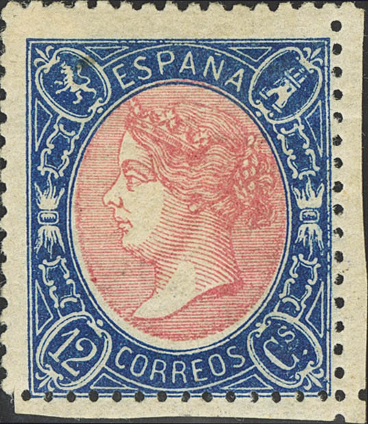 ★ 76. 1865. 12 cuartos azul (centraje habitual). Color intenso. MAGNIFICO. Cert. COMEX.