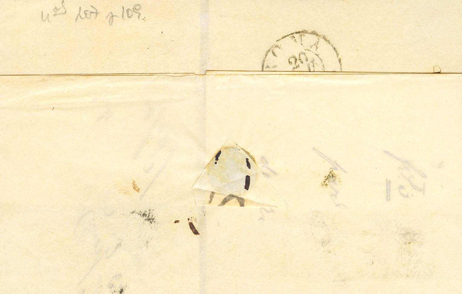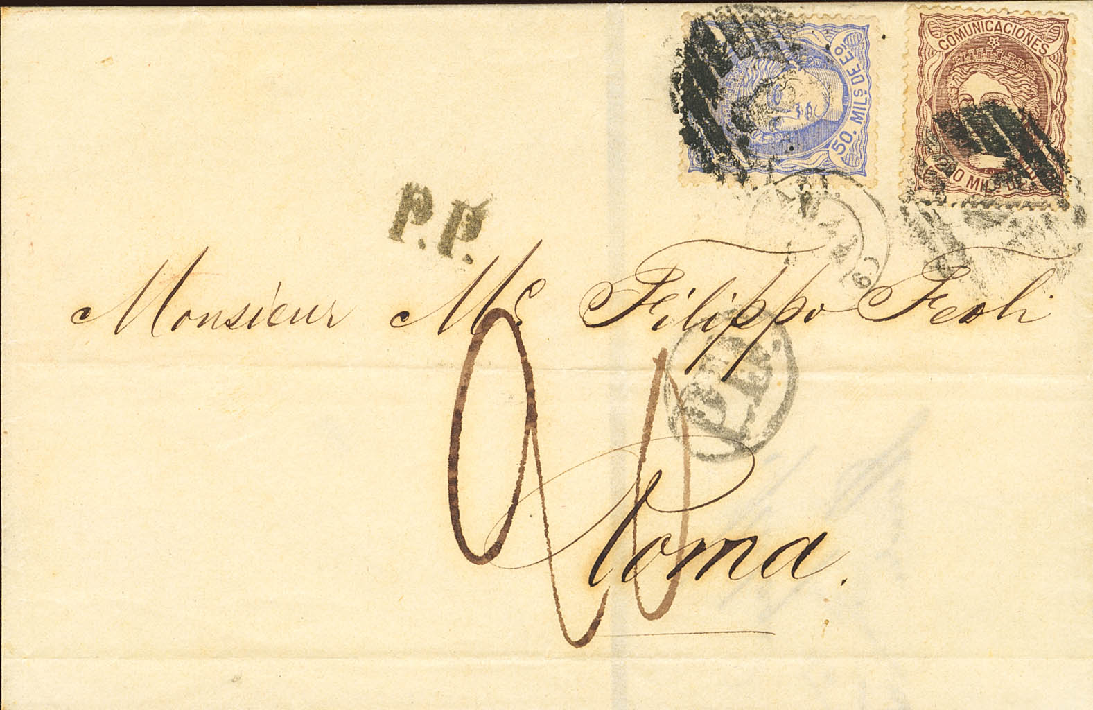 107, 109. 1870. 50 mils ultramar y 200 mils castaño. MALAGA a ROMA (ITALIA). Tarifa de 250 mils a Italia. MAGNIFICA E INUSUAL TARIFA.