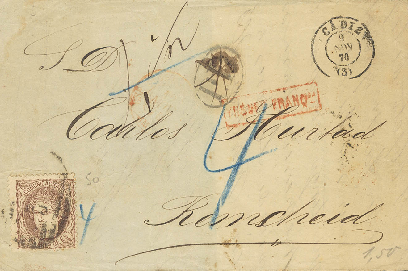 109. 1870. 200 mils castaño. Frontal de CADIZ a REMSCHEID (ALEMANIA). En el frente marca YNSUF. FRANAQDA., en rojo y PD anulado a tinta. MAGNIFICO.