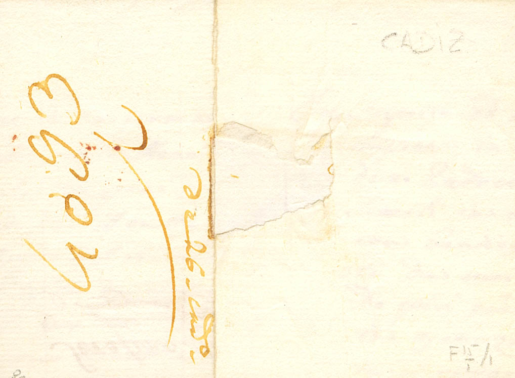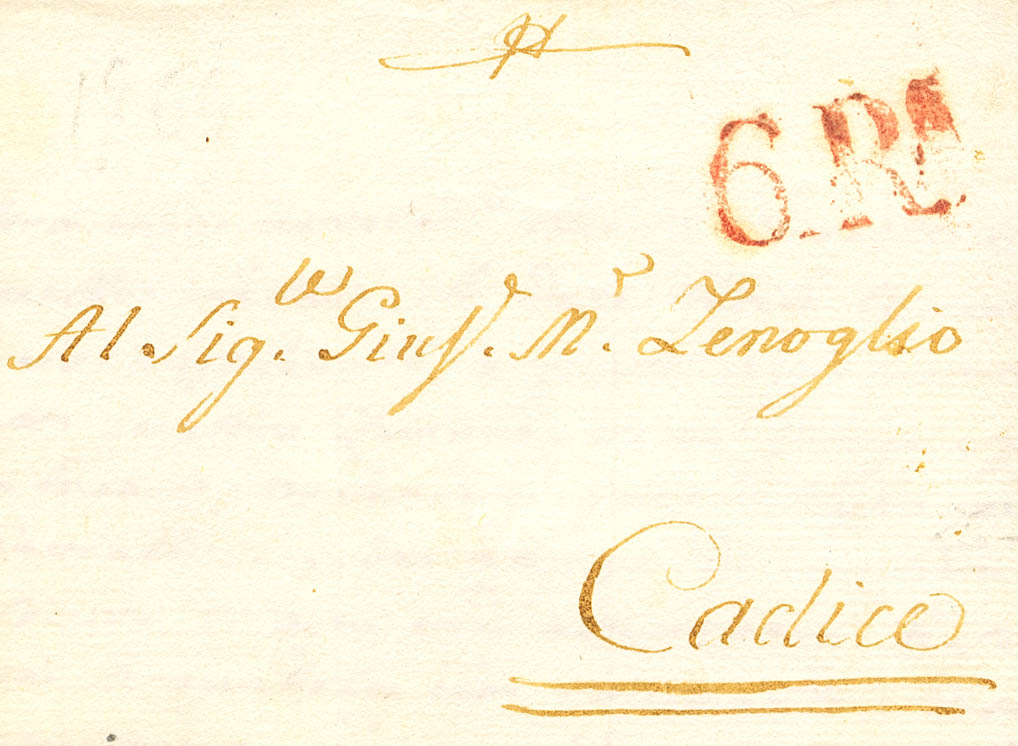 1764. GENOVA a CADIZ. Porteo de cuño "6R", en rojo. MAGNIFICA. Ex-Antonio Cuesta.