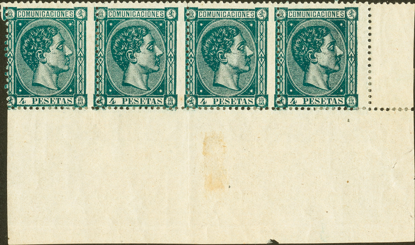★ 170. 1875. 4 pts verde oscuro, tira de cuatro, esquina de pliego. MAGNIFICA Y RARISIMA, PIEZA DE ENORME ESPECTACULARIDAD.