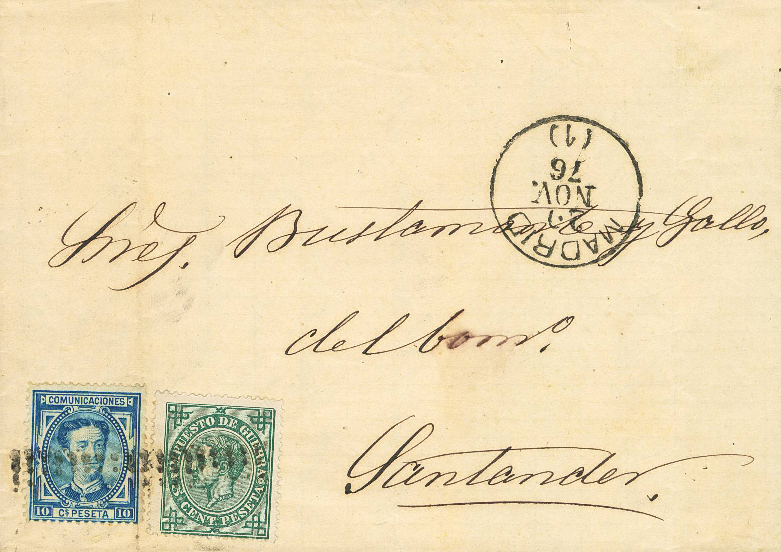 175, 183. 1876. 10 cts azul y 5 cts verde. MADRID a SANTANDER. Matasello RECTANGULO DE PUNTOS, de Madrid (muy probablemente utilizado como ensayo). MAGIFICA Y MUY RARA.