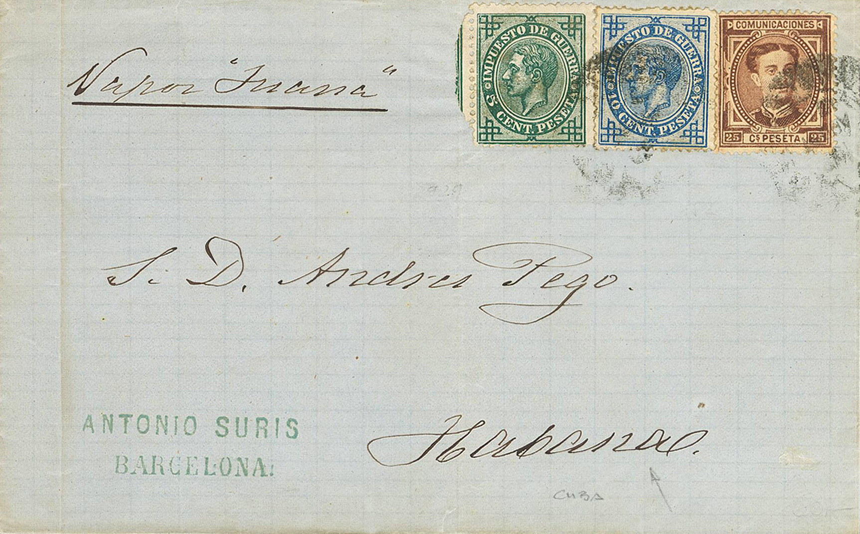 177, 183, 184. 1877. 25 cts castaño rojo, 5 cts verde y 10 cts azul. BARCELONA a LA HABANA (CUBA). En el frente anotación manuscrita "Vapor Juana". MAGNIFICA Y RARA.