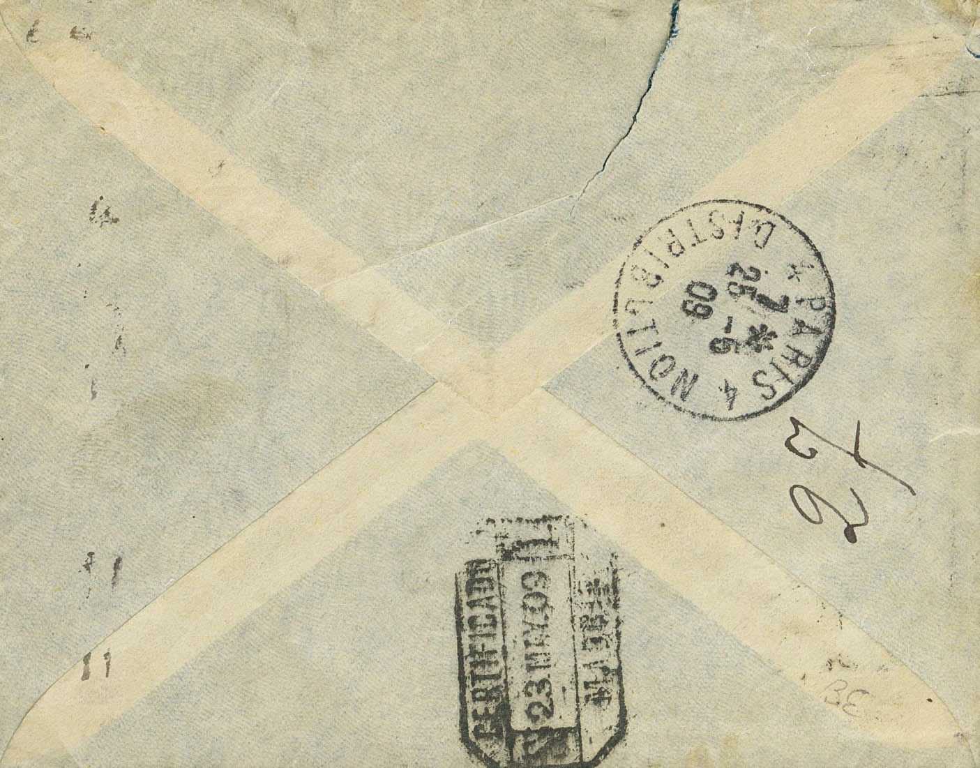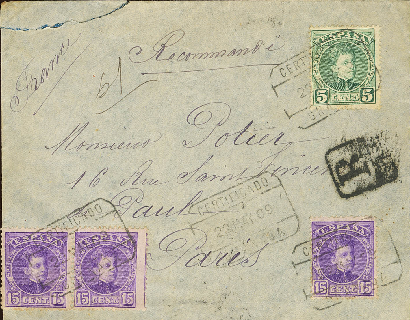 242, 246(3). 1901. 5 cts verde, 15 cts violeta, pareja y un sello. Certificado de GRANADA a PARIS (FRANCIA). Al dorso llegada. MAGNIFICA.