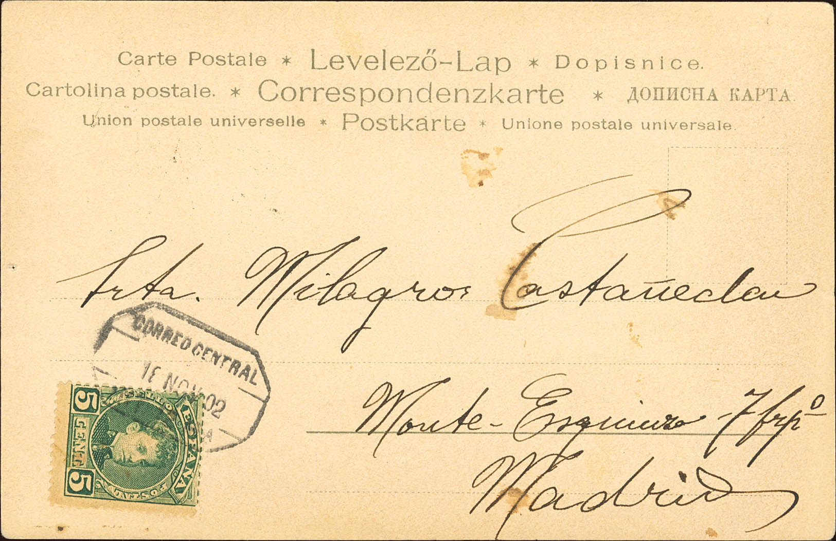 242. 1902. 5 cts verde sobre Tarjeta Postal Correo Interior a MADRID. Matasello CORREO CENTRAL / INT.12Mª. MAGNIFICA.