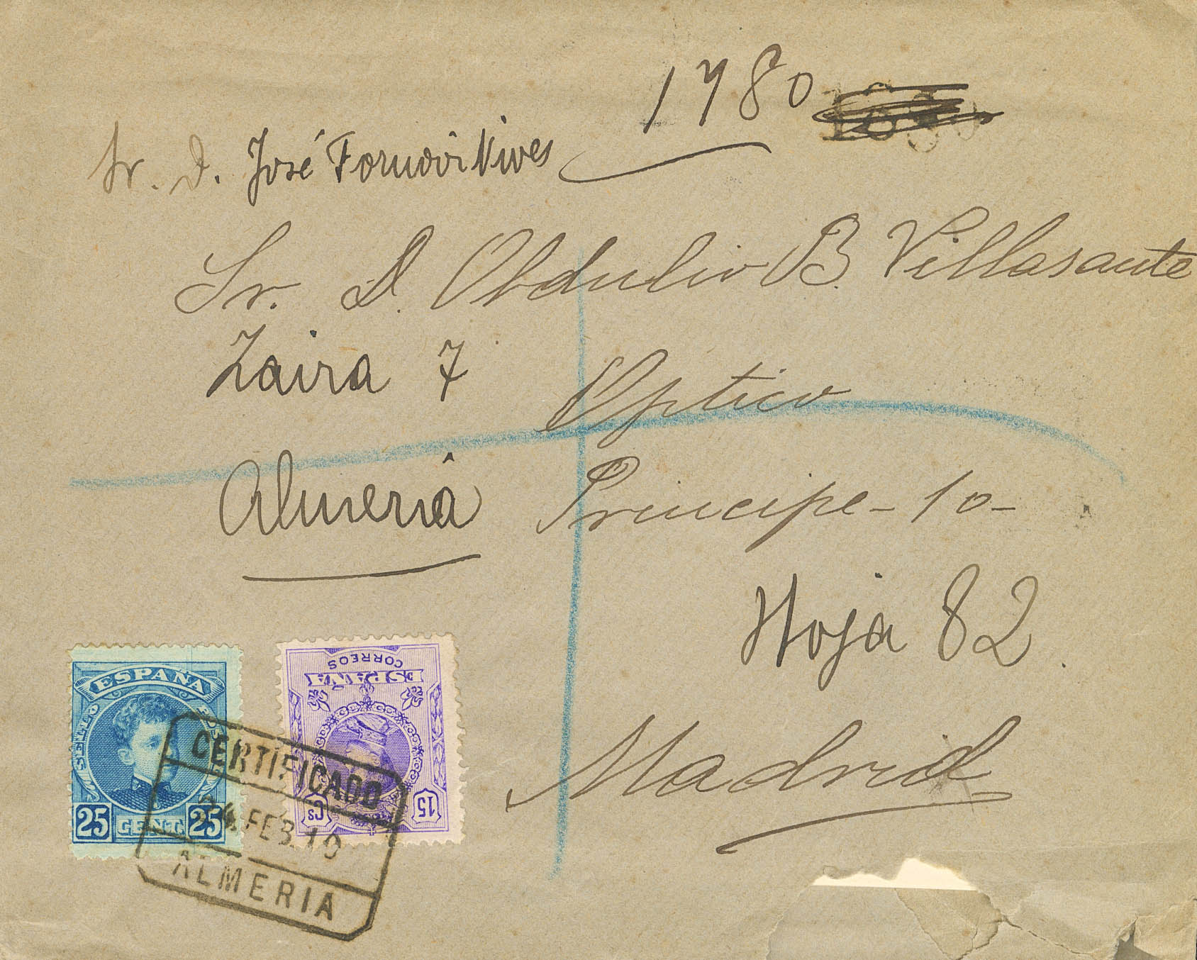 248, 270. 1910. 25 cts azul y 15 cts violeta. Certificado de ALMERIA a MADRID. Al dorso llegada. MAGNIFICA Y MUY RARO FRANQUEO DE DOS EMISIONES DIFERENTES.