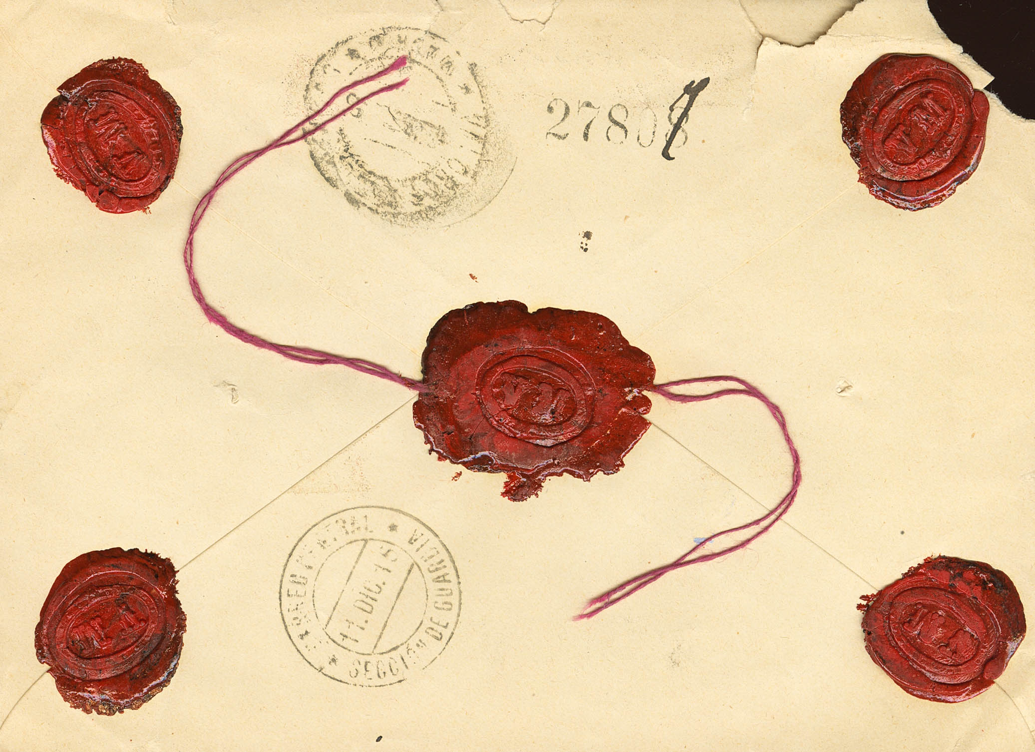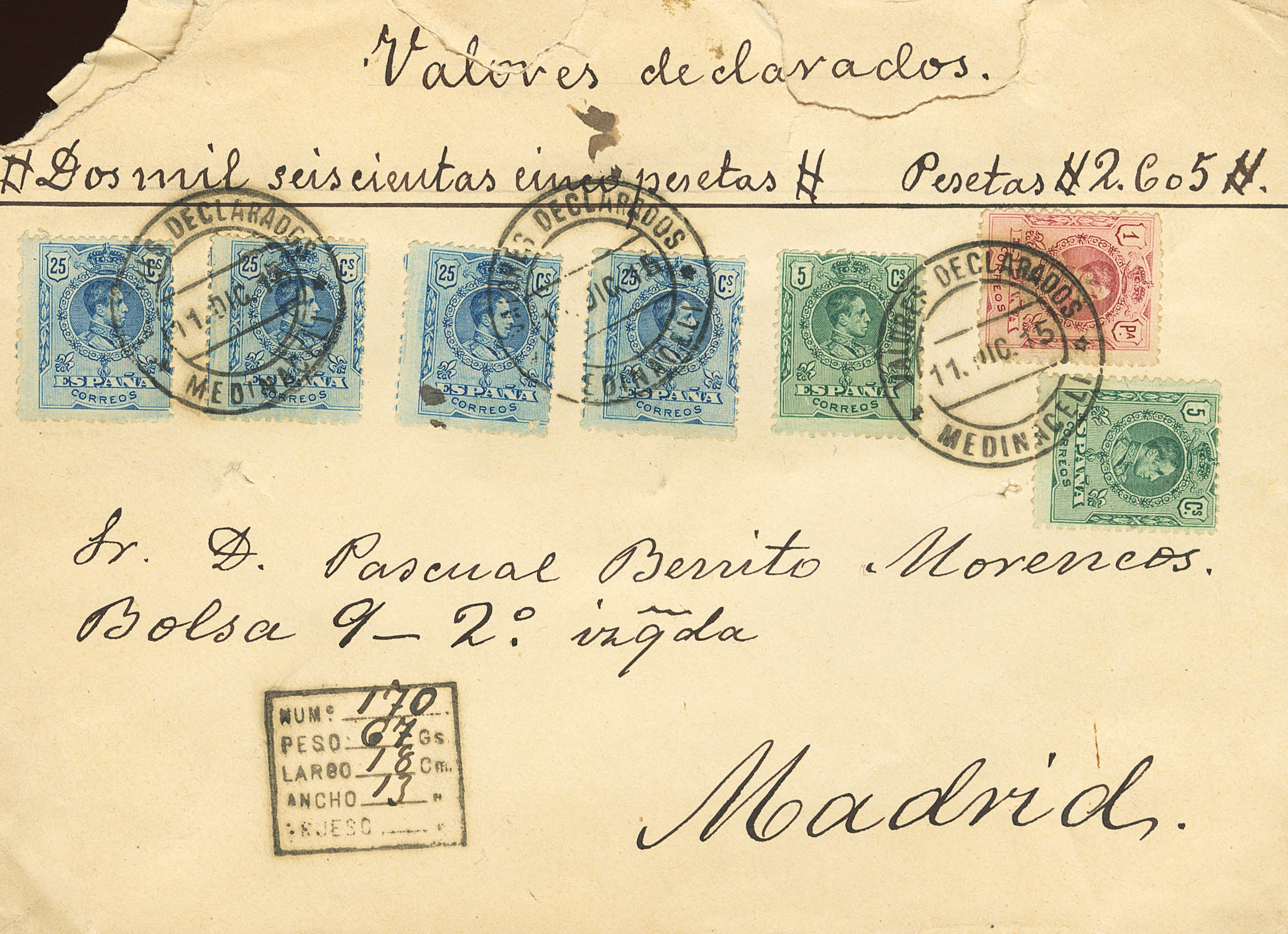 268(2), 274(4), 278. 1915. 5 cts verde, dos sellos, 25 cts azul, cuatro sellos y 1 pts carmín. Valores Declarados de MEDINACELI (SORIA) a MADRID. Al dorso llegada. MAGNIFICA Y ESPECTACULAR FRANQUEO.