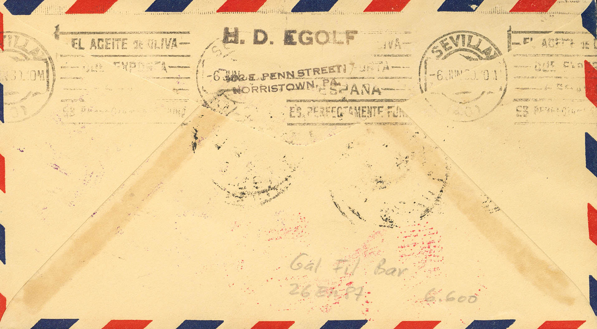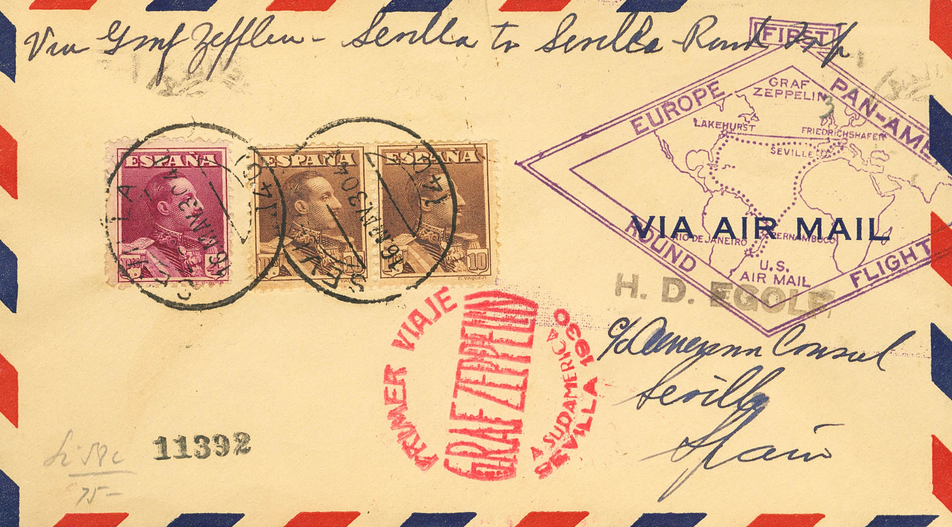 322, 323(2). 1930. 4 pts violeta y 10 pts castaño, pareja. Tarjeta Postal Graf Zeppelin vuelo circular SEVILLA-SEVILLA. Marcas PRIMER VIAJE / GRAF ZEPPELIN / A SUDAMERICA / SEVILLA 1930, en rojo y FIRST EUROPE PAN-AMERICAN / ROUND FLIGHT, en violeta y al dorso llegada. MAGNIFICA.