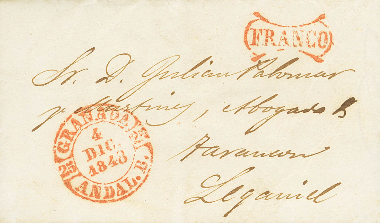 1848. GRANADA a LEGANIEL (CUENCA). Baeza GRANADA / ANDAL.B. (Tipo I) y marca de uso general FRANCO (P.E.31) edición 2004. MAGNIFICA Y MUY RARA.