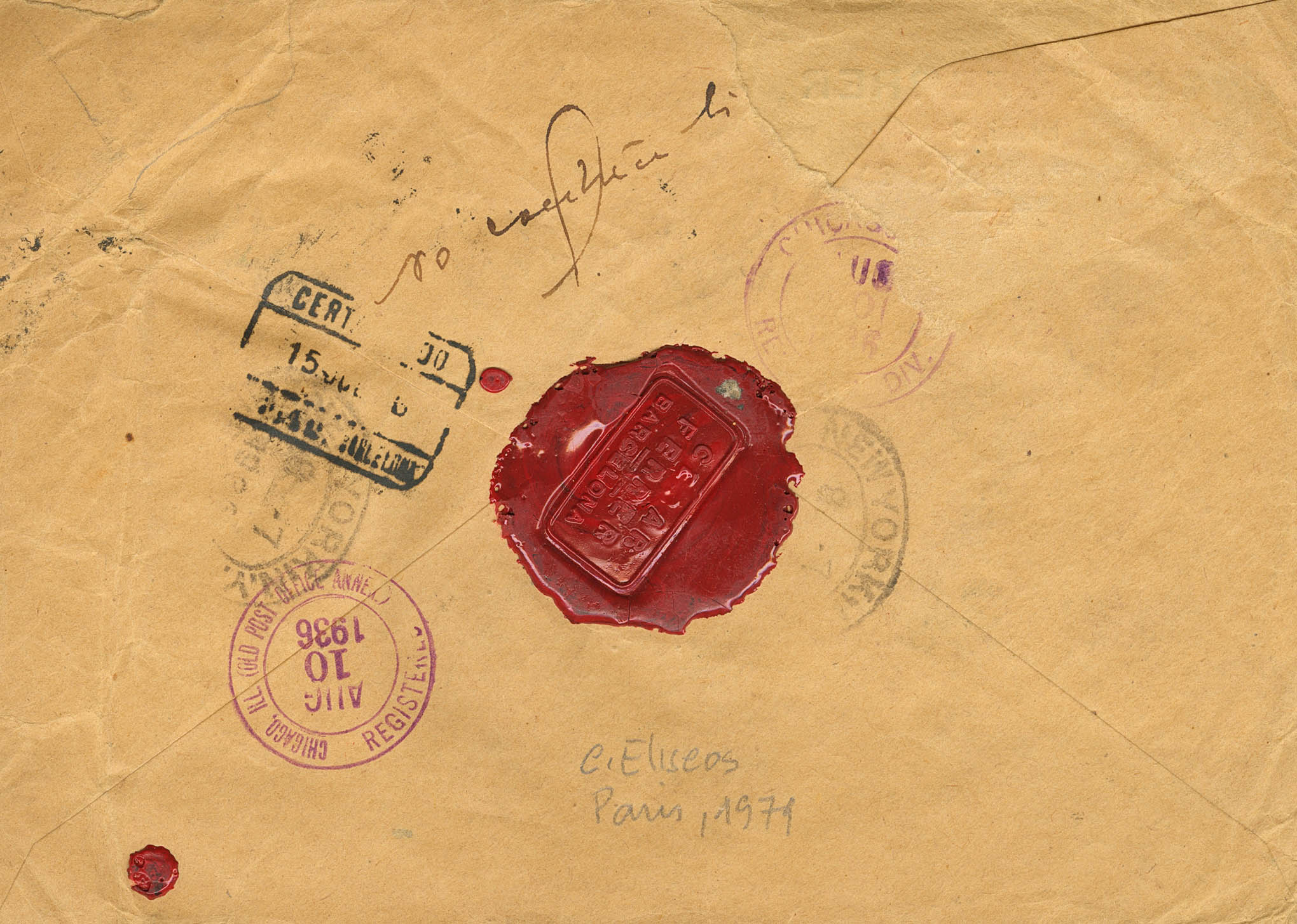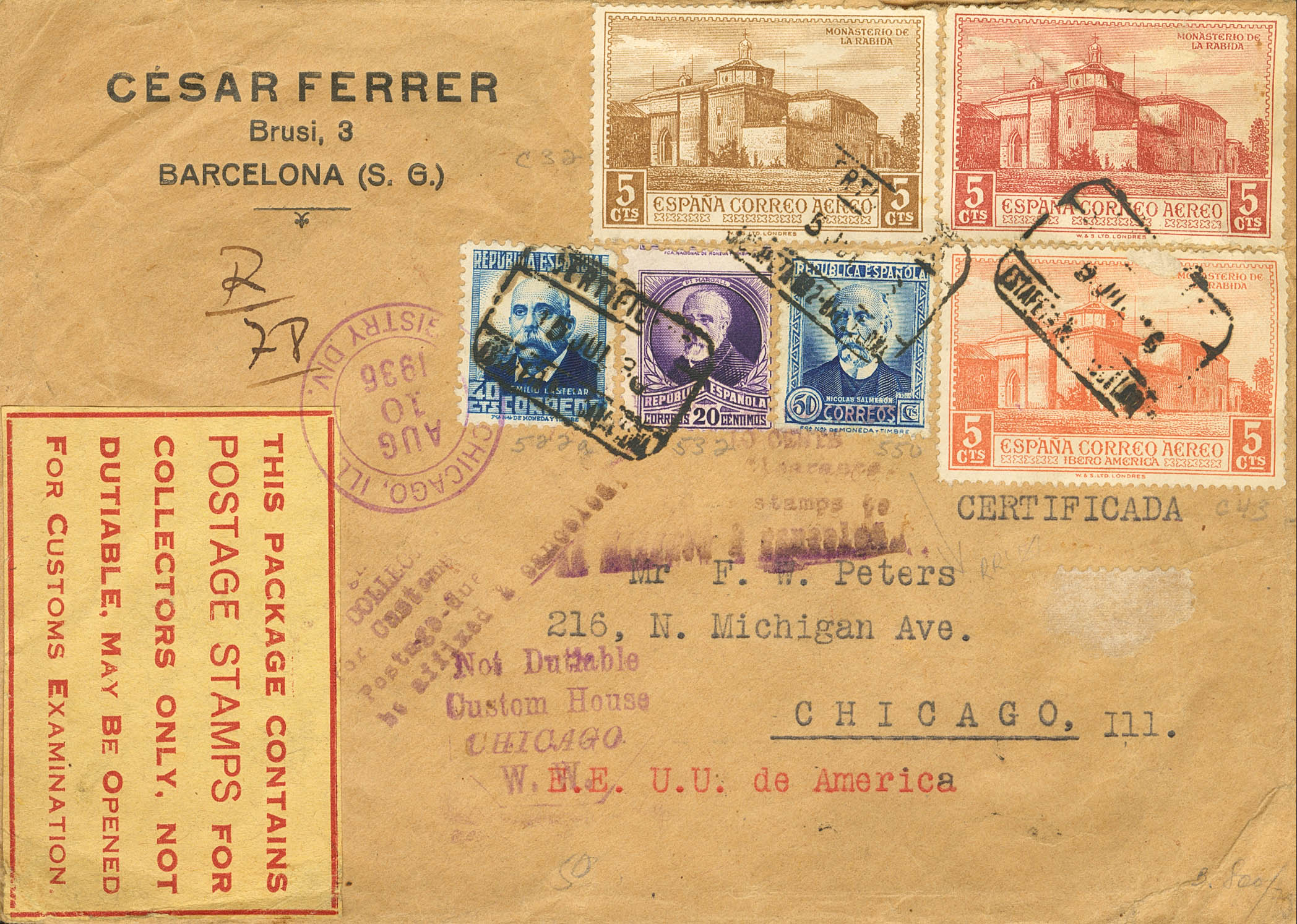 688. 1936. 50 cts azul, diversos valores. Certificado de BARCELONA a CHICAGO (ESTADOS UNIDOS). Al dorso llegada. MAGNIFICA Y ESPECTACULAR FRANQUEO.