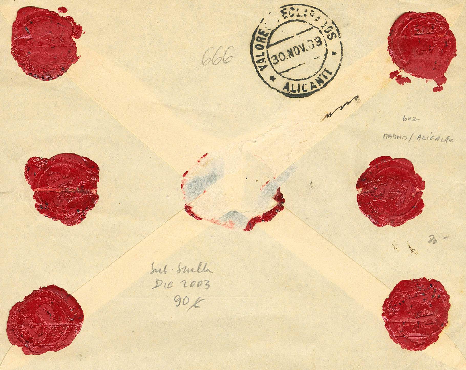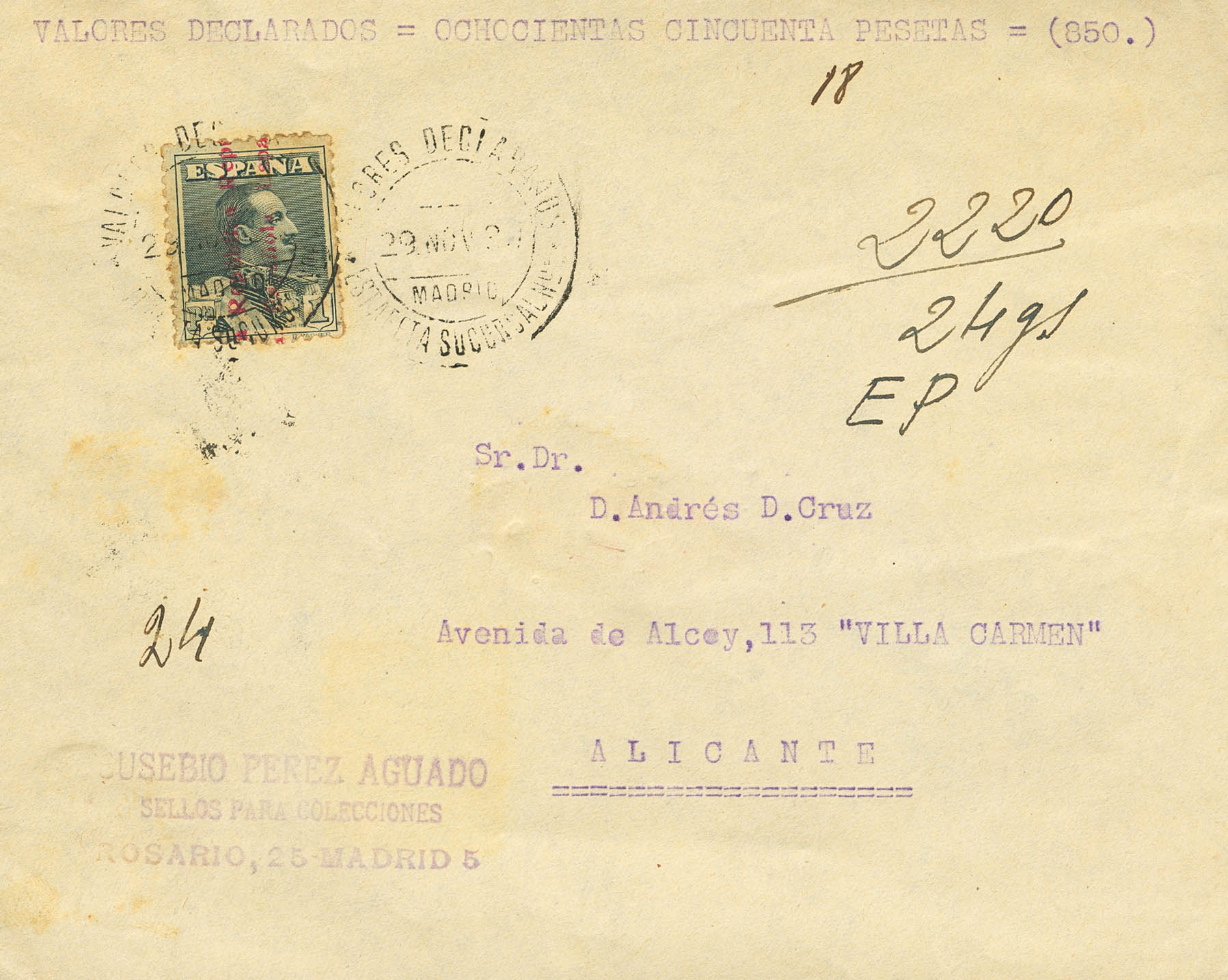 602. 1933. 1 pts pizarra. Valores Declarados MADRID a ALICANTE. Al dorso llegada. MAGNIFICA.