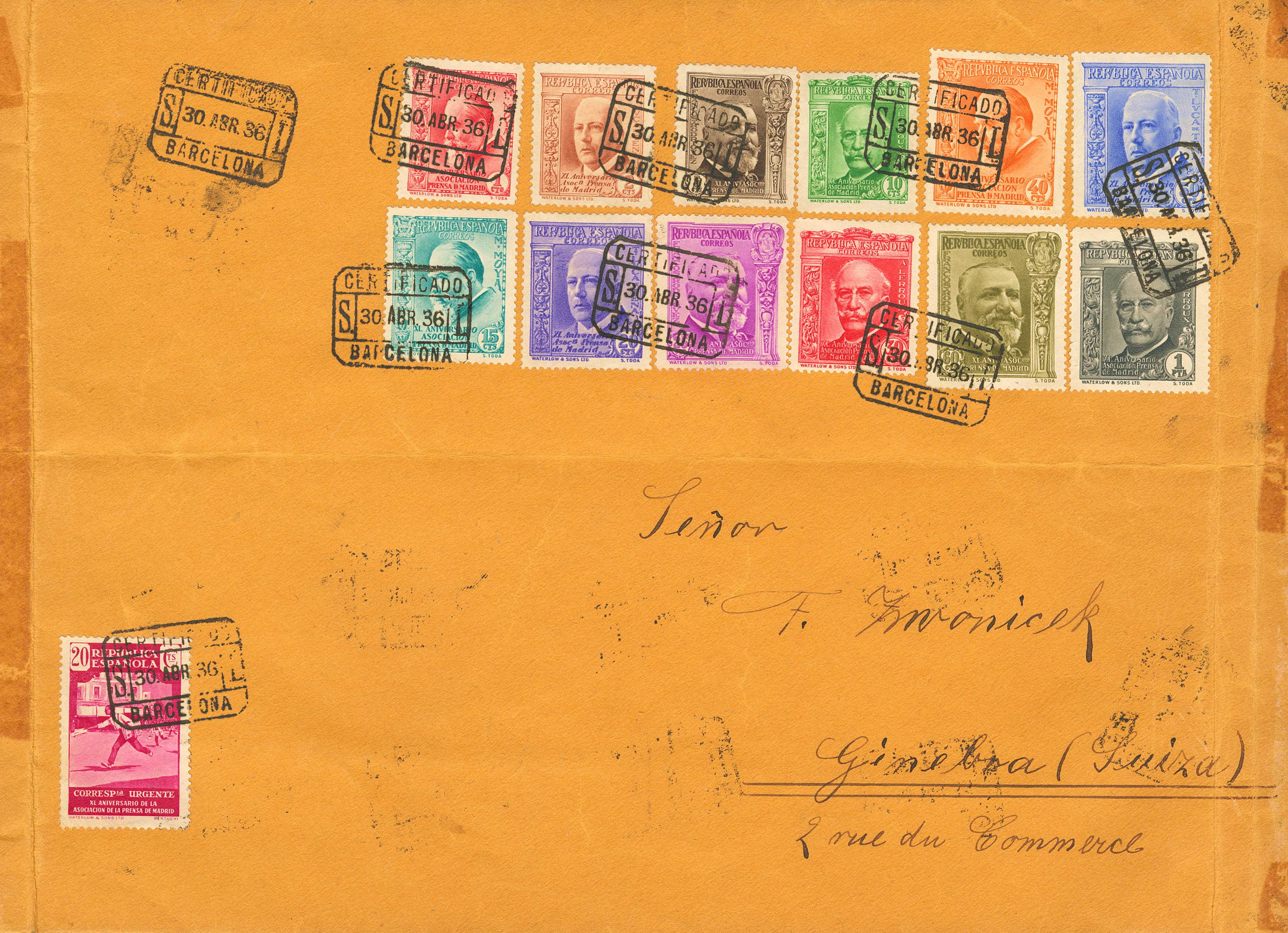 695/06, 710. 1936. 1 pts negro, diversos valores. Certificado de BARCELONA a GINEBRA (SUIZA). MAGNIFICA.