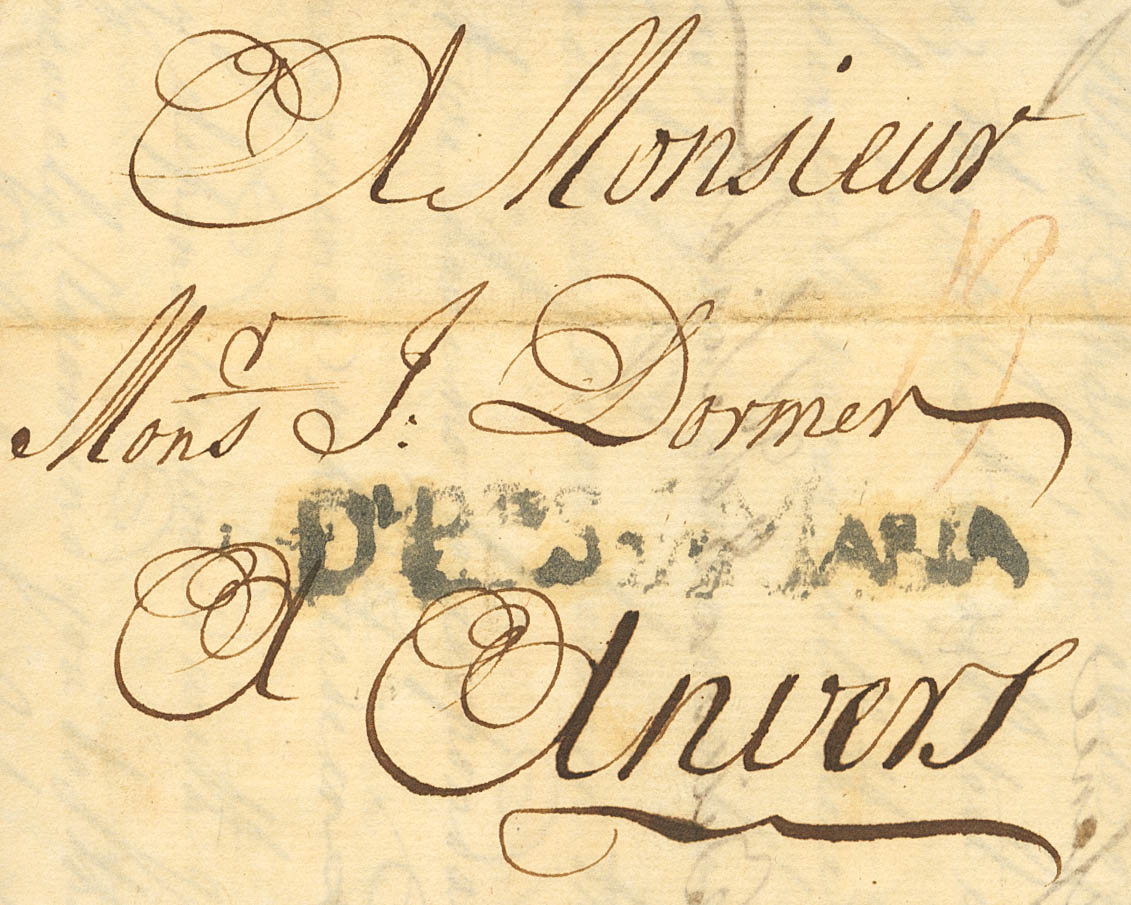 1747. PUERTO DE SANTA MARIA a AMBERES (BELGICA). Marca DL. PTº.STª.MARIA, en negro (P.E.1) edición 2004. MAGNIFICA Y MUY RARA. Ex-Antonio Cuesta.