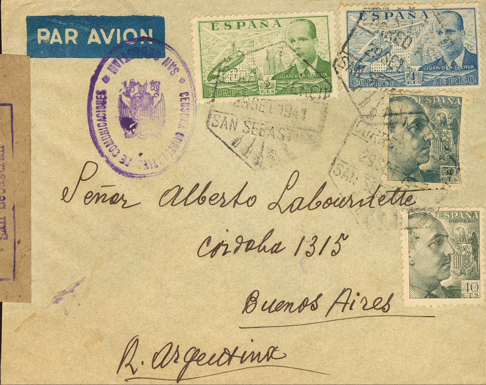 885, 886, 925, 926. 1941. 2 pts verde, 4 pts azul, 40 cts verde gris y 50 cts gris. SAN SEBASTIAN a BUENOS AIRES (ARGENTINA). Al dorso llegada. MAGNIFICA.