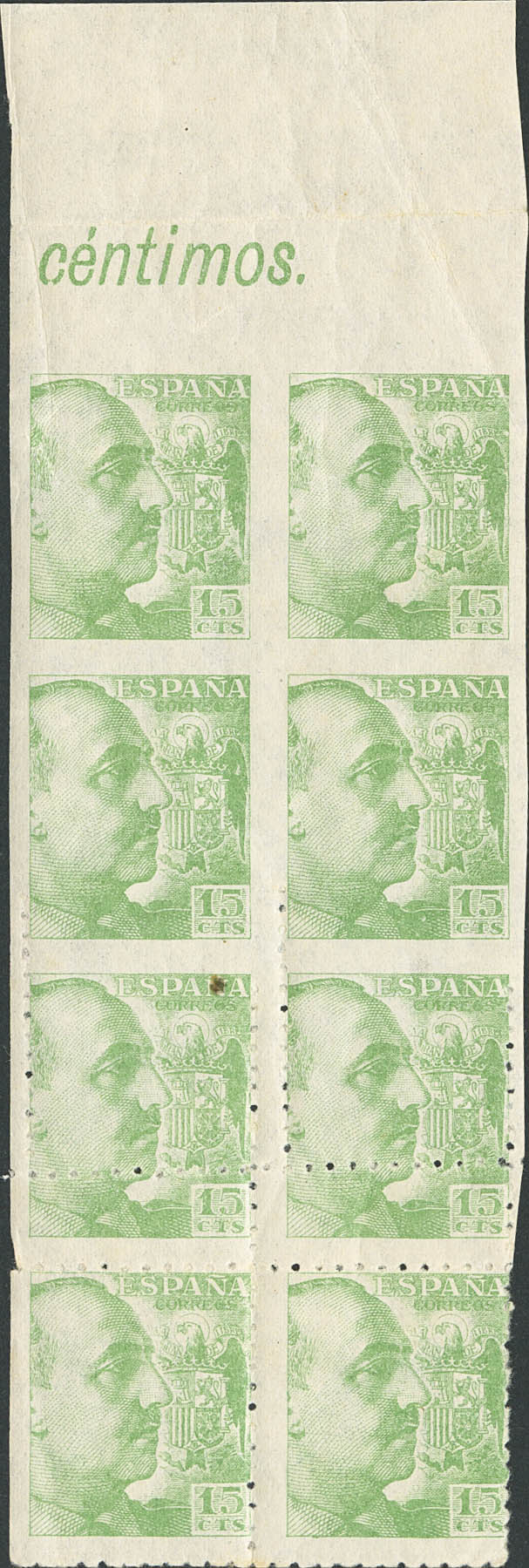 ★★ 921s(4), 921dd. 1940. 15 cts verde amarillo, bloque de ocho. Cuatro sellos SIN DENTAR y dos con DOBLE DENTADO. MAGNIFICO Y RARO. Cert. CEM. Edifil 2021: ++862 Euros
