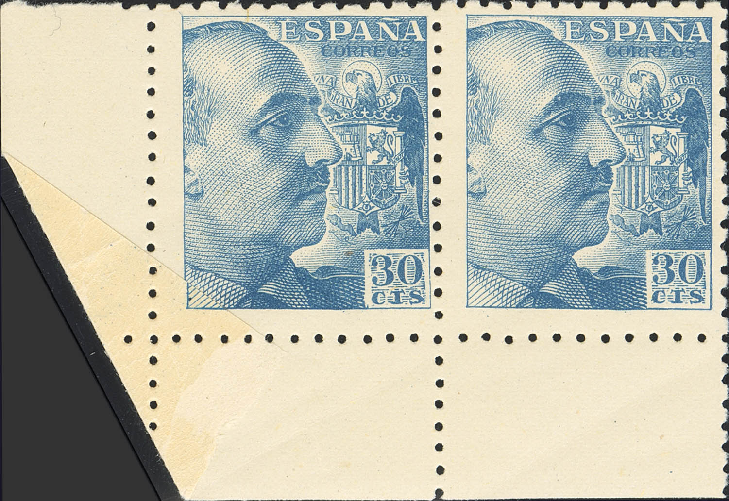 ★★ 924(2). 1939. 30 cts azul, pareja, esquina de pliego. Un sello IMPRESION PARCIAL, originada por pliegue del papel. MAGNIFICA.