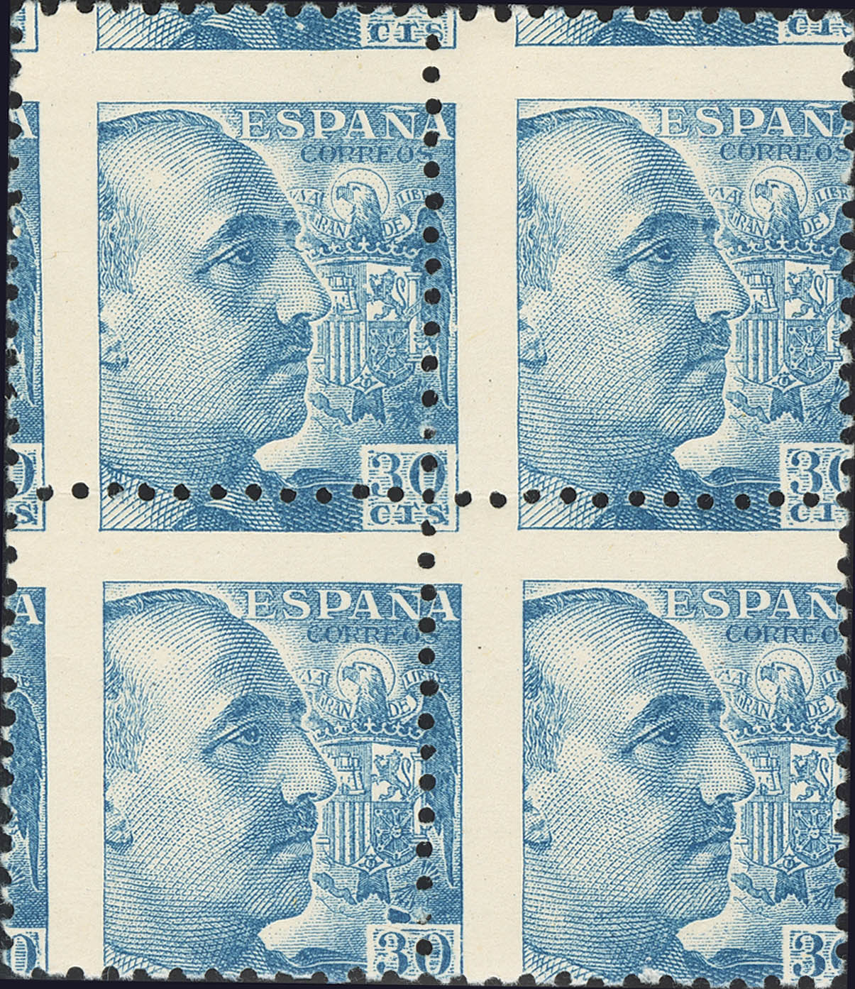 ★★/★ 924(4). 1939. 30 cts azul, bloque de cuatro. DENTADO DESPLAZADO. MAGNIFICO.