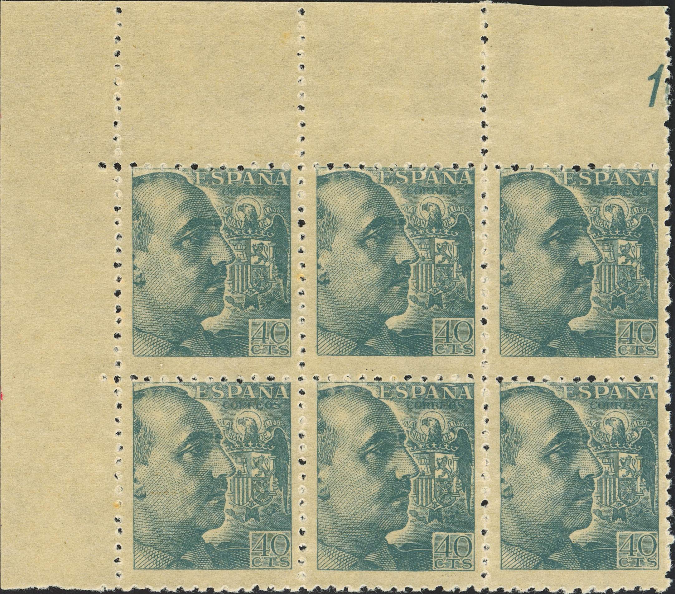 ★★ 925eg(6). 1939. 40 cts gris azulado, bloque de seis, esquina de pliego. IMPRESO EN EL LADO DE LA GOMA. MAGNIFICO Y RARO.