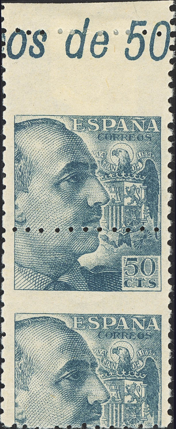 ★ 927dh. 1939. 50 cts gris, pareja vertical. DENTADO HORIZONTAL DESPLAZADO. MAGNIFICA. Edifil 2021: +43 Euros