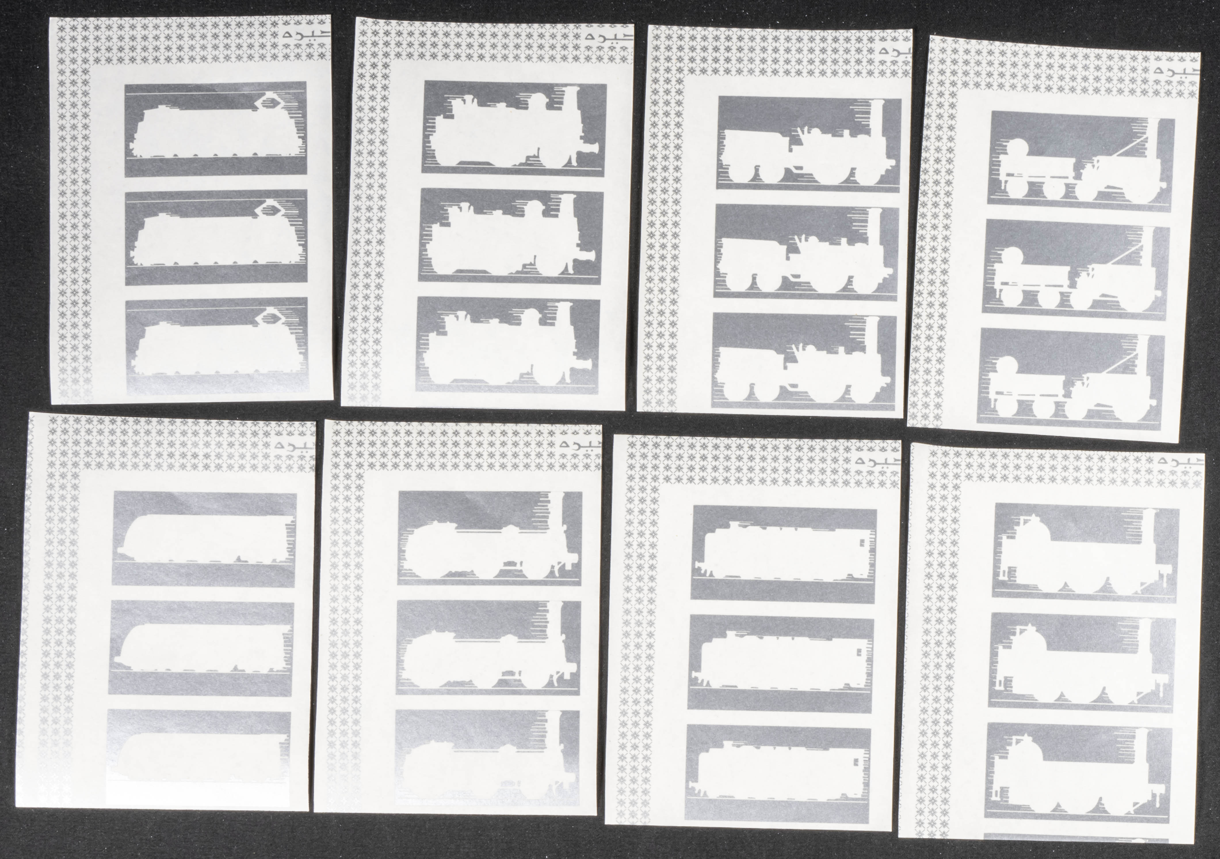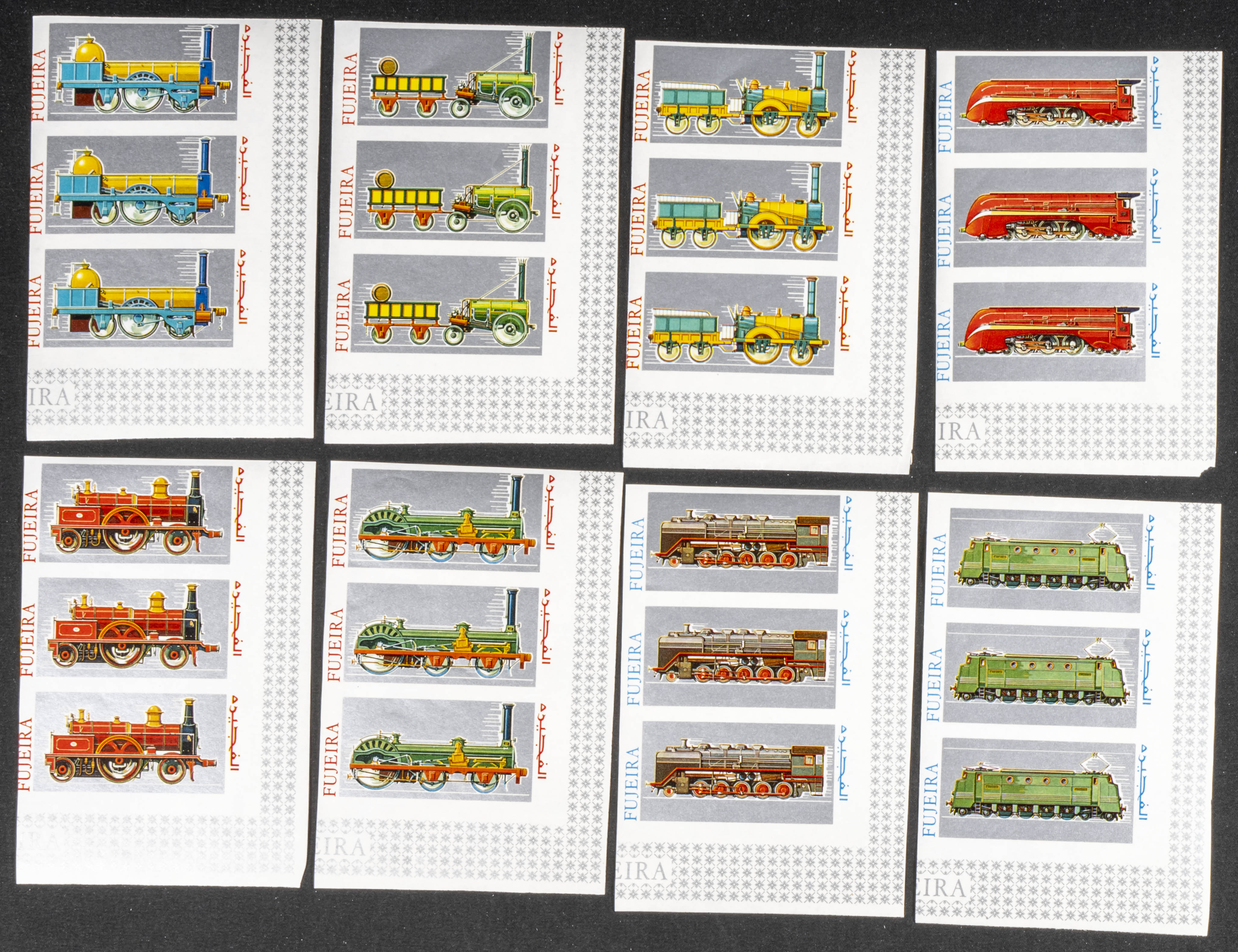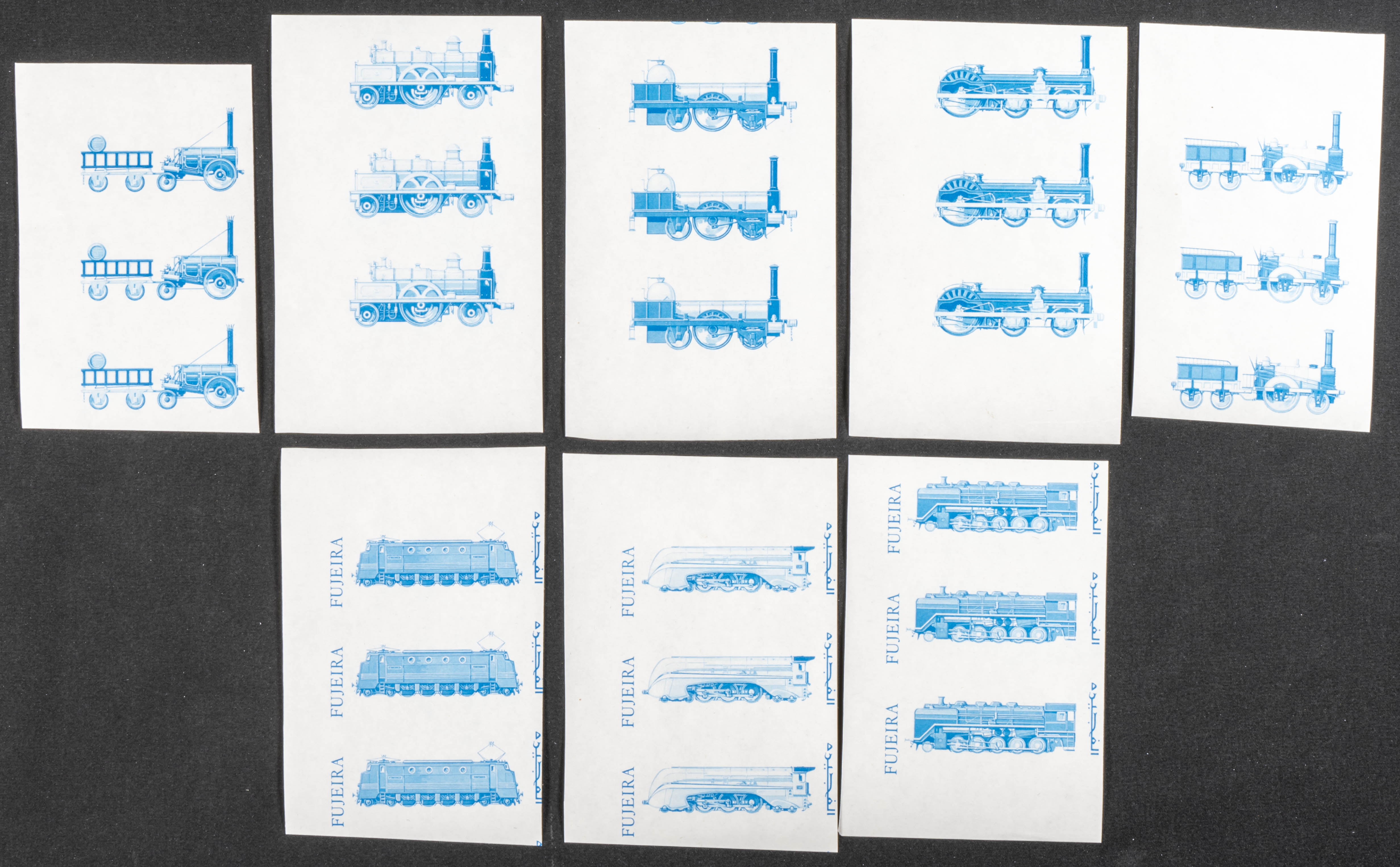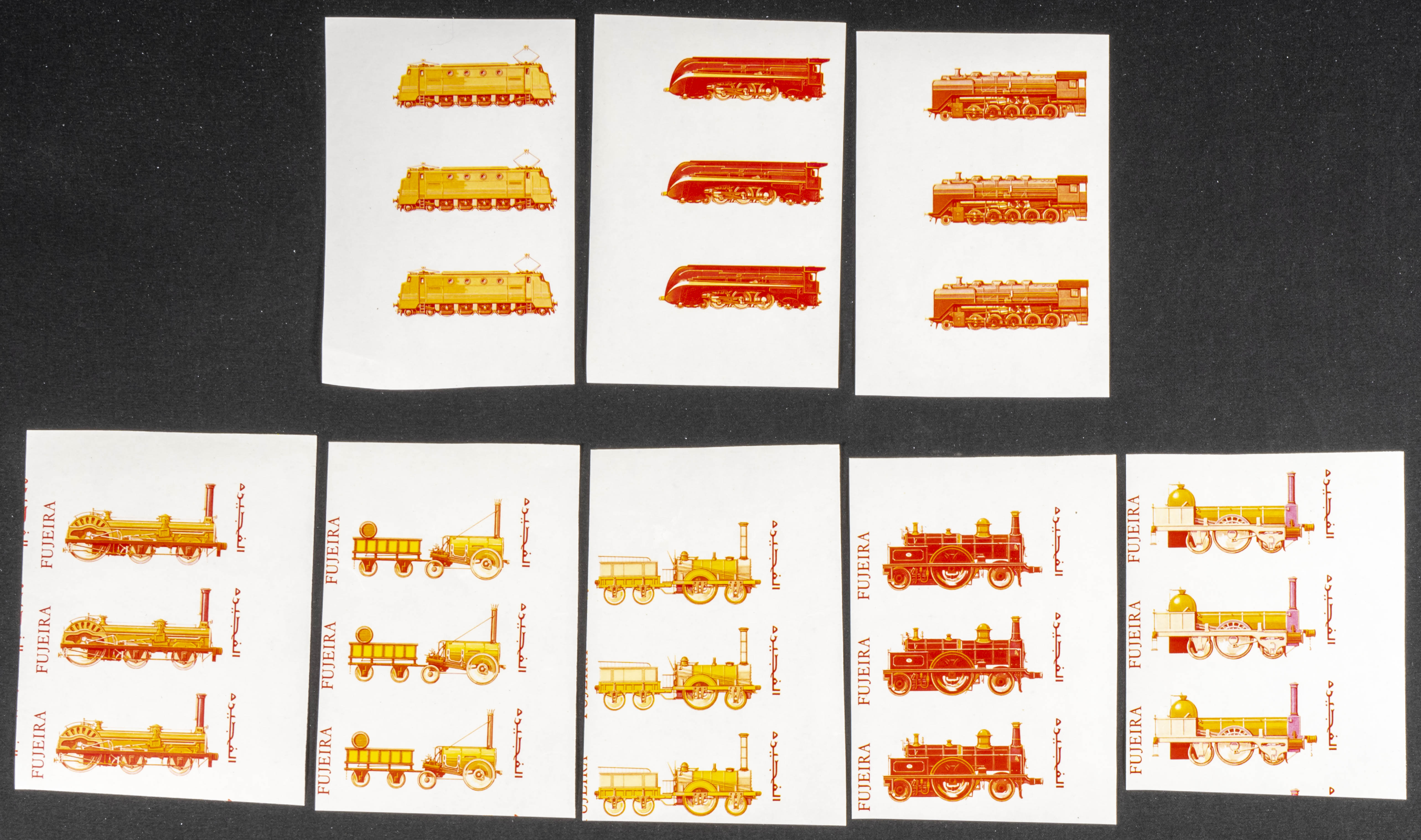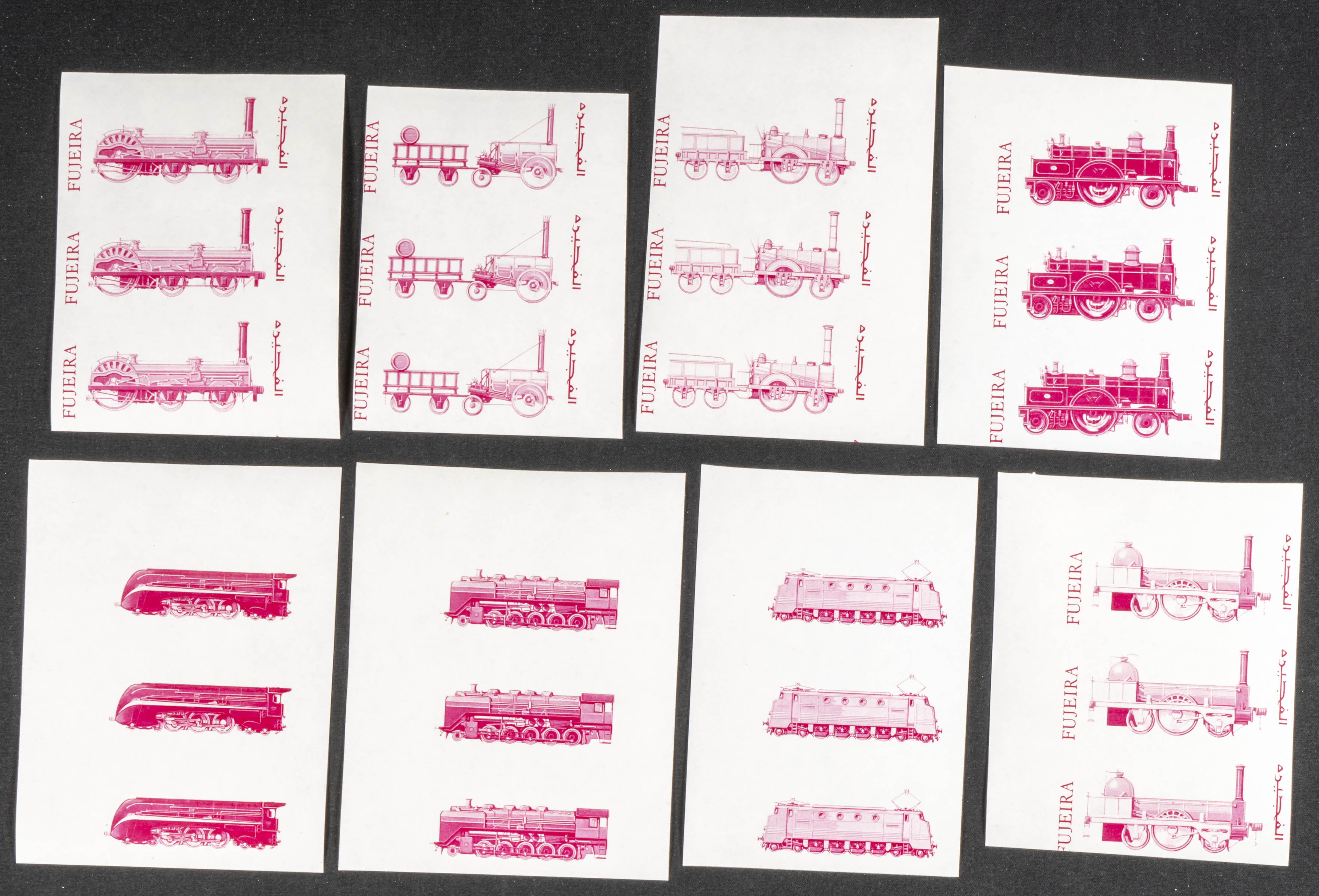 ★★1969. Locomotives. Group of progressive plate proofs of the set. (Michel: 333/40). TO EXAM.