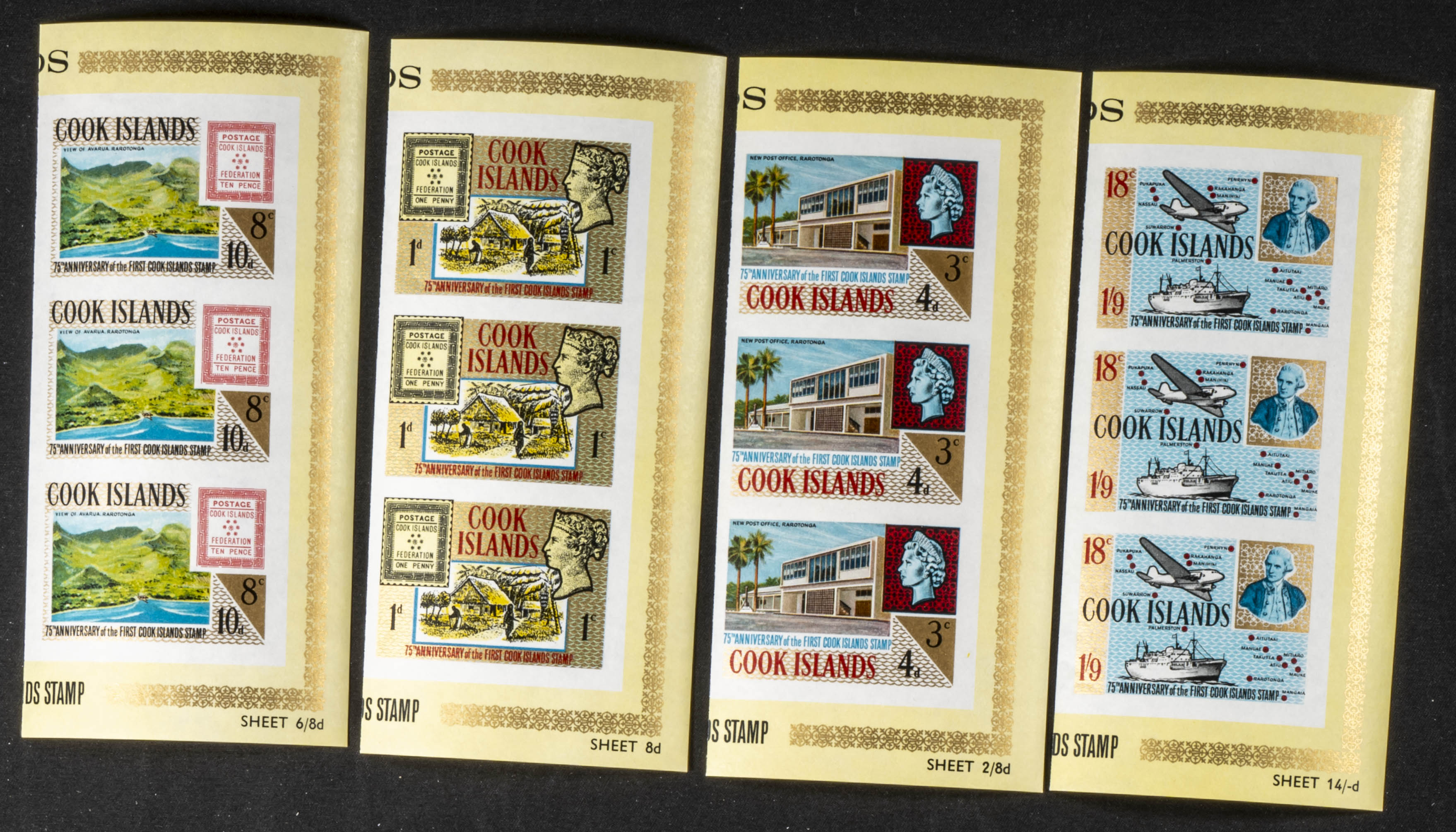 ★★Yvert 156/59. 1967. 75 years stamps Cook Islands. Group of IMPERFORATED sets. TO EXAM.