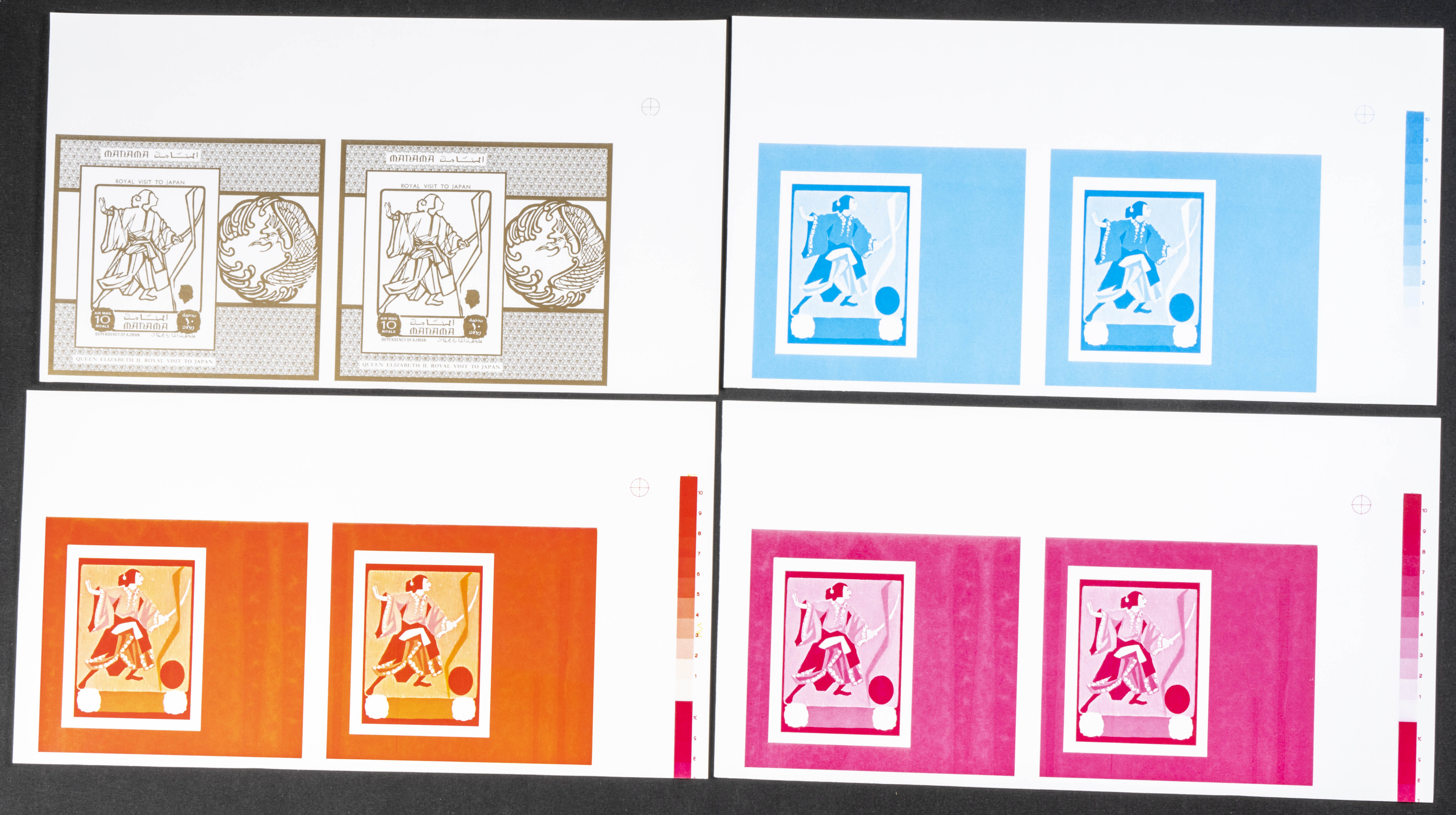 ★★1971. Elizabeth II Japan visit. Group of progressive plate proofs of the set. (Michel: B136). TO EXAM.