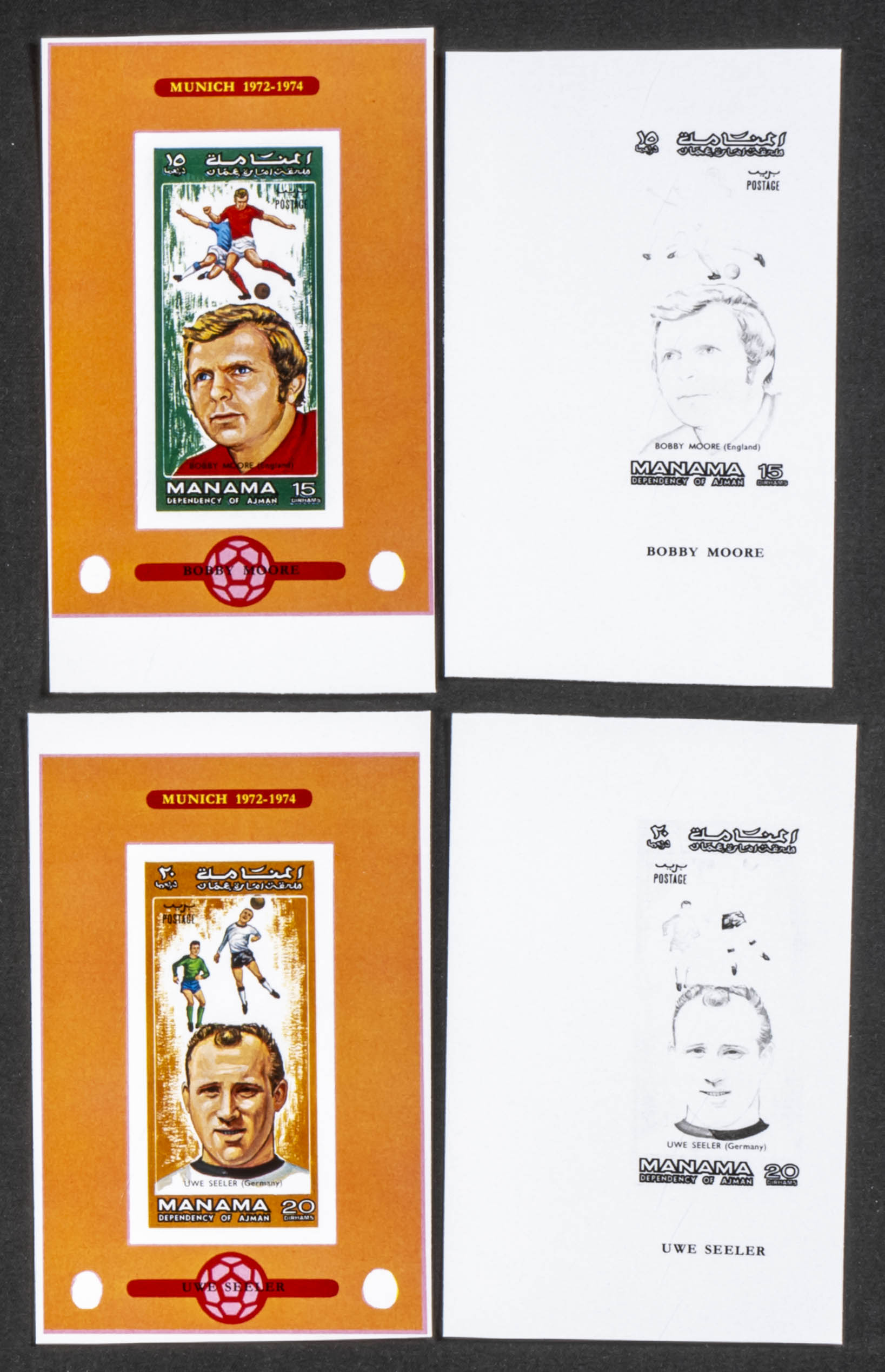 ★★1972. Famous football players. Group of progressive plate proofs of the set, of mini sheets. (Michel: 718/23). TO EXAM.