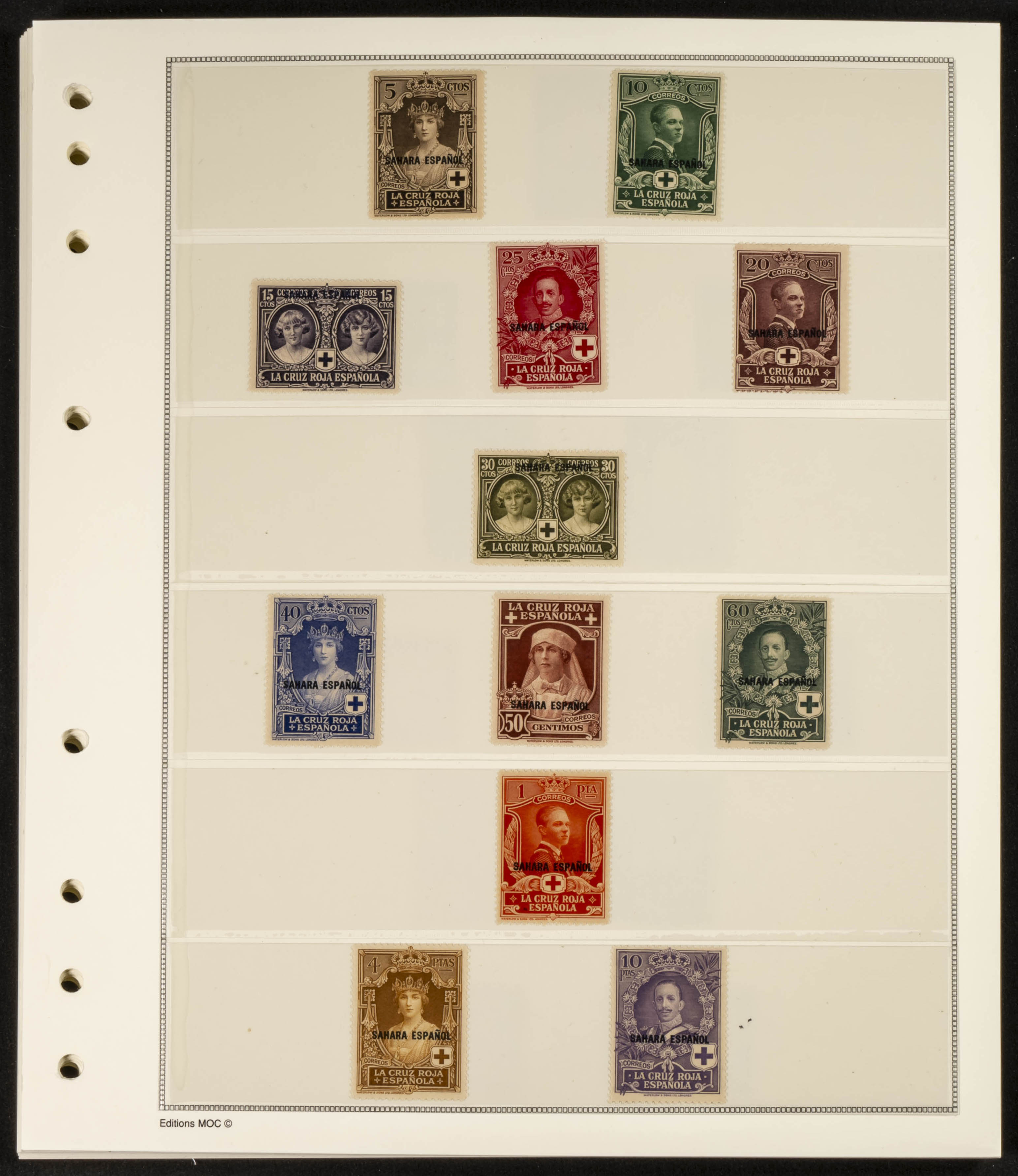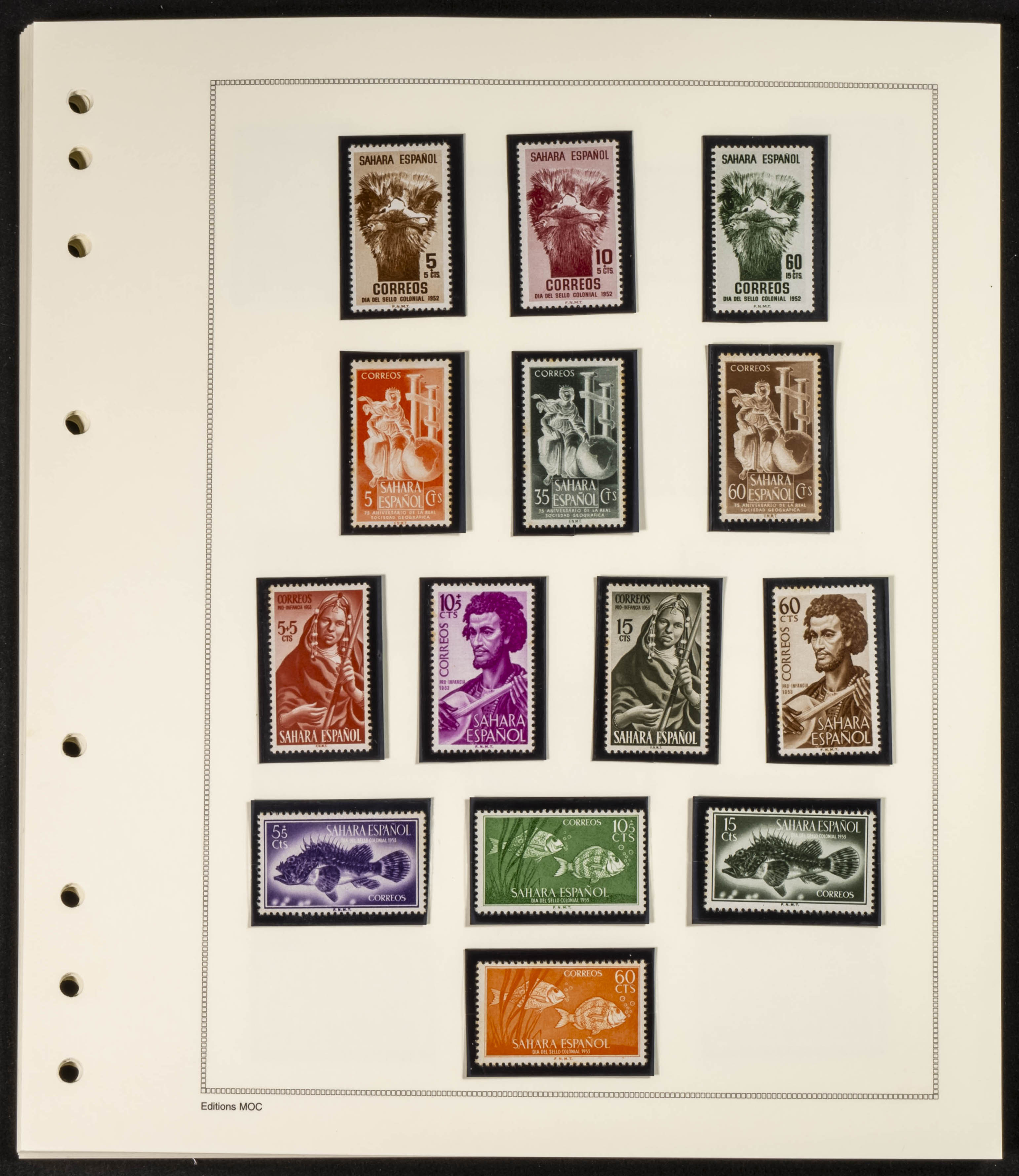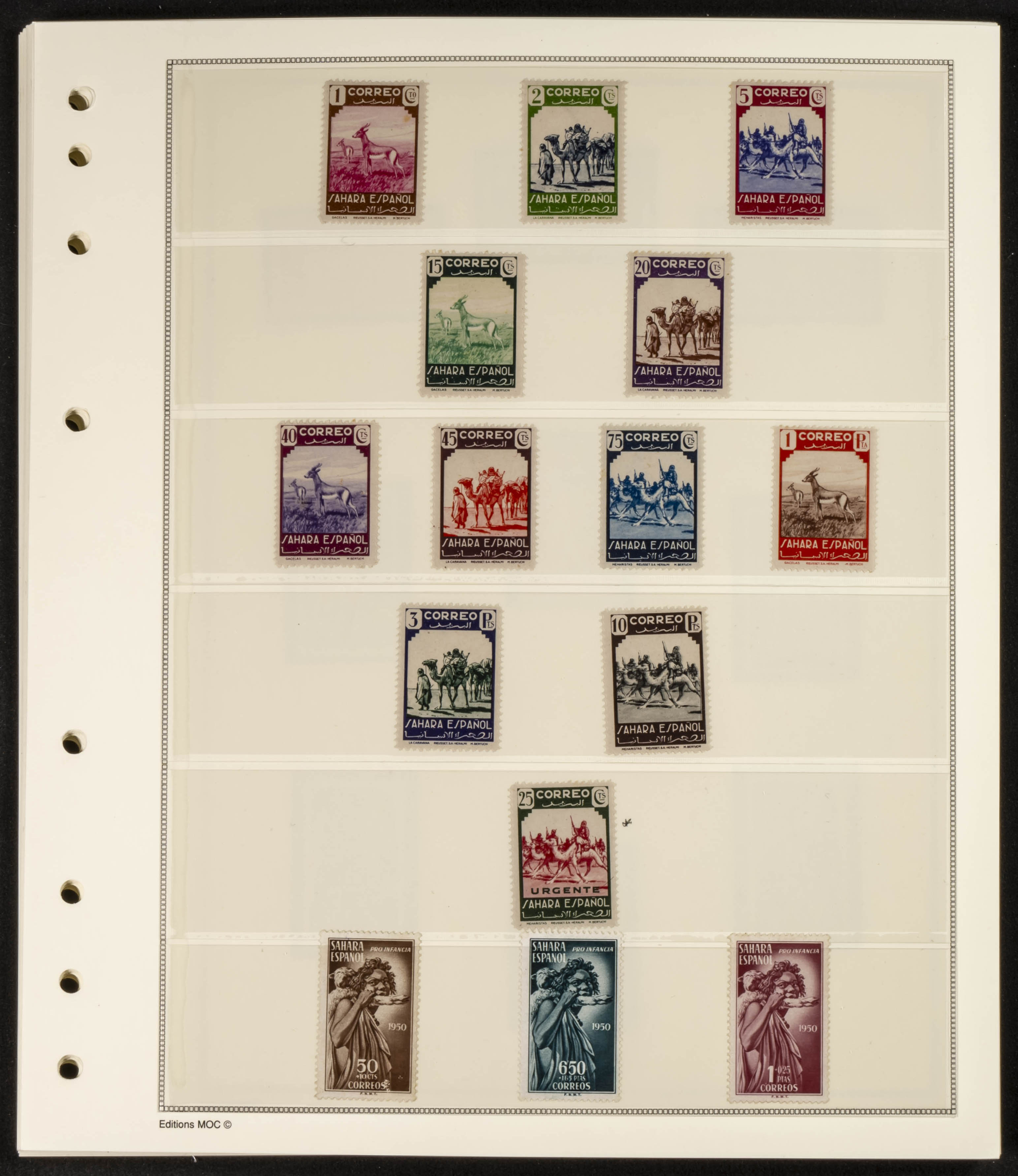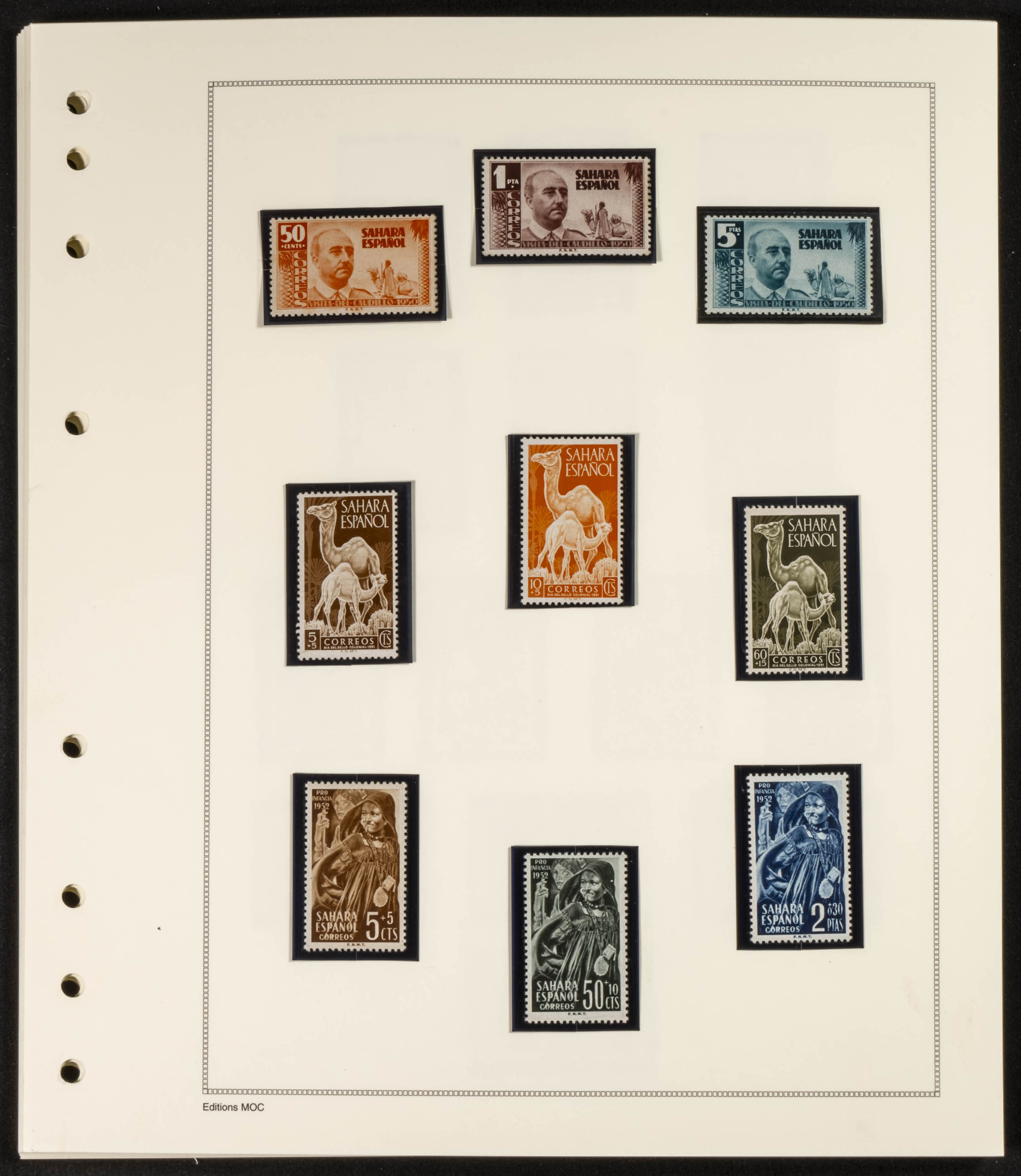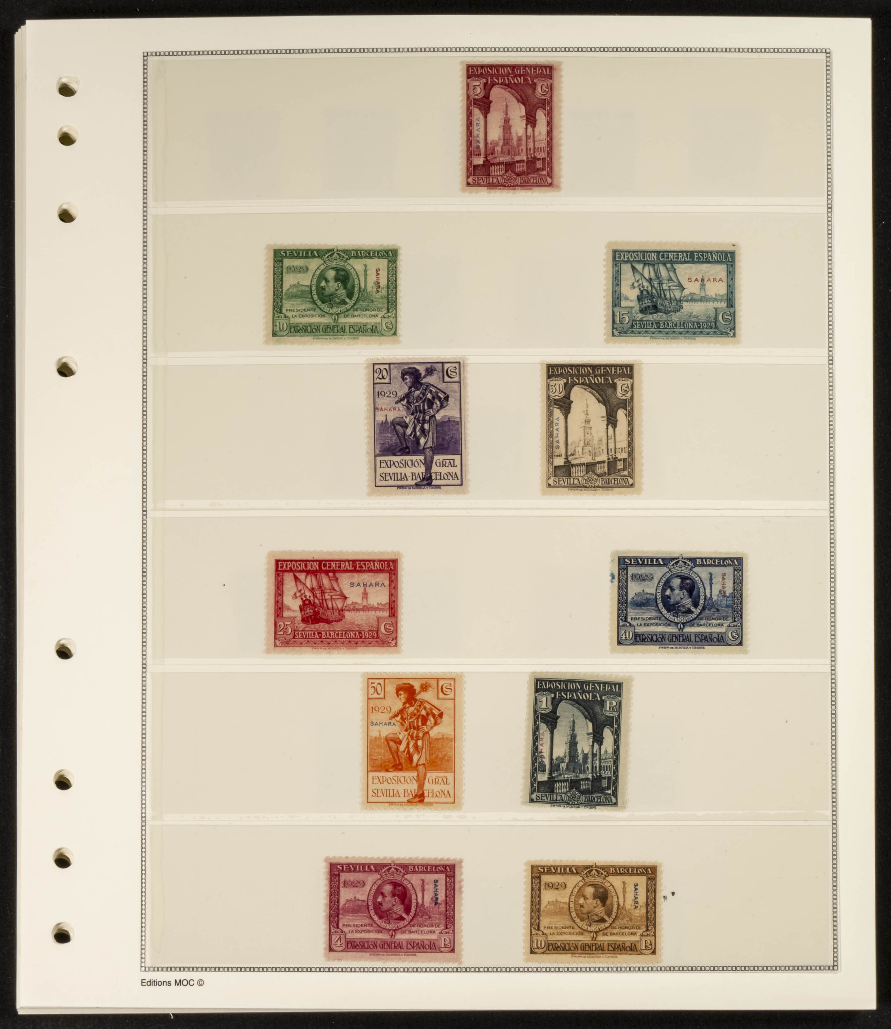 ★★/★(1926ca). Interesante colección de Sahara entre 1926 y 1975, en nuevo y con algunas series sin fijasellos, destacando la serie de Sevilla-Barcelona (**), No Emitida de 1937 dentada y Sobrecarga República de 1931. ALTO VALOR DE CATALOGO. A EXAMINAR.
