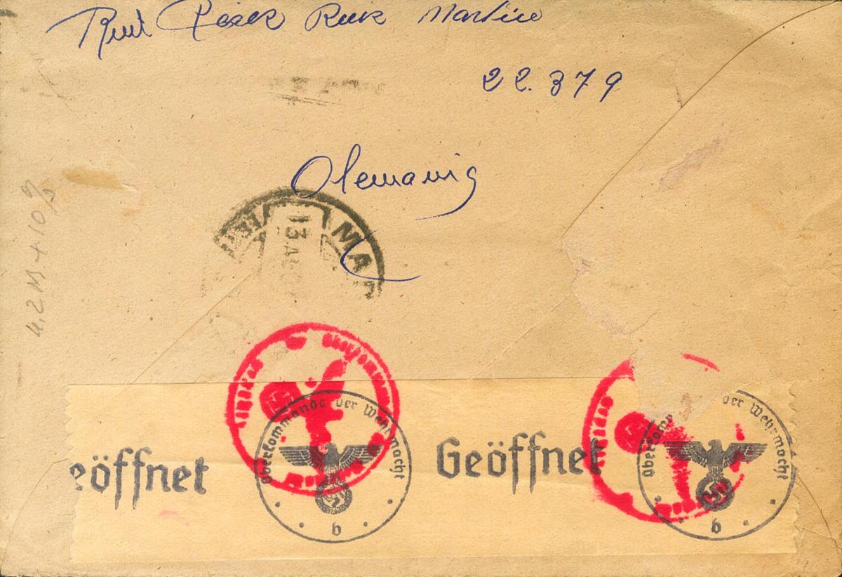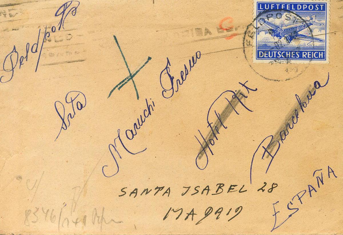 1942. FRENTE DE LENINGRADO (2 de Agosto). Sello alemán sin cifra del valor, ultramar. FELDPOST Nº22379 (Grupo Antitanques 250, 1ª Compañía) a MADRID, dirigida a la actriz Maruchi Fresno, que ejerció de Madrina de Guerra (texto interior). Matasello FELDPOST / B. MAGNIFICA Y RARA.