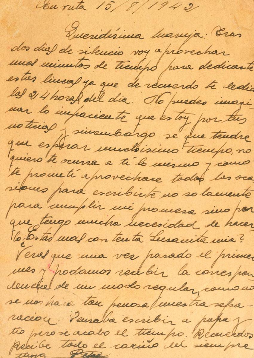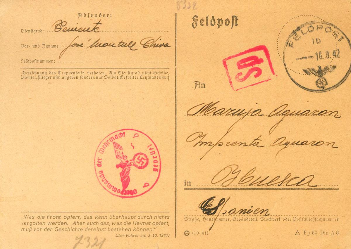 1942. FRENTE DE LENINGRADO (15 de Agosto). Tarjeta Postal dirigida a HUESCA, remitida sin número de unidad por un Teniente, muy probablemente con Feldpost Nº42413, de la Jefatura de Abastecimientos (conocemos otra tarjeta que lo indica). Fechador FELDPOST / IB y marcas de censura y SP (pequeño), ambas en rojo. MAGNIFICA Y RARA.