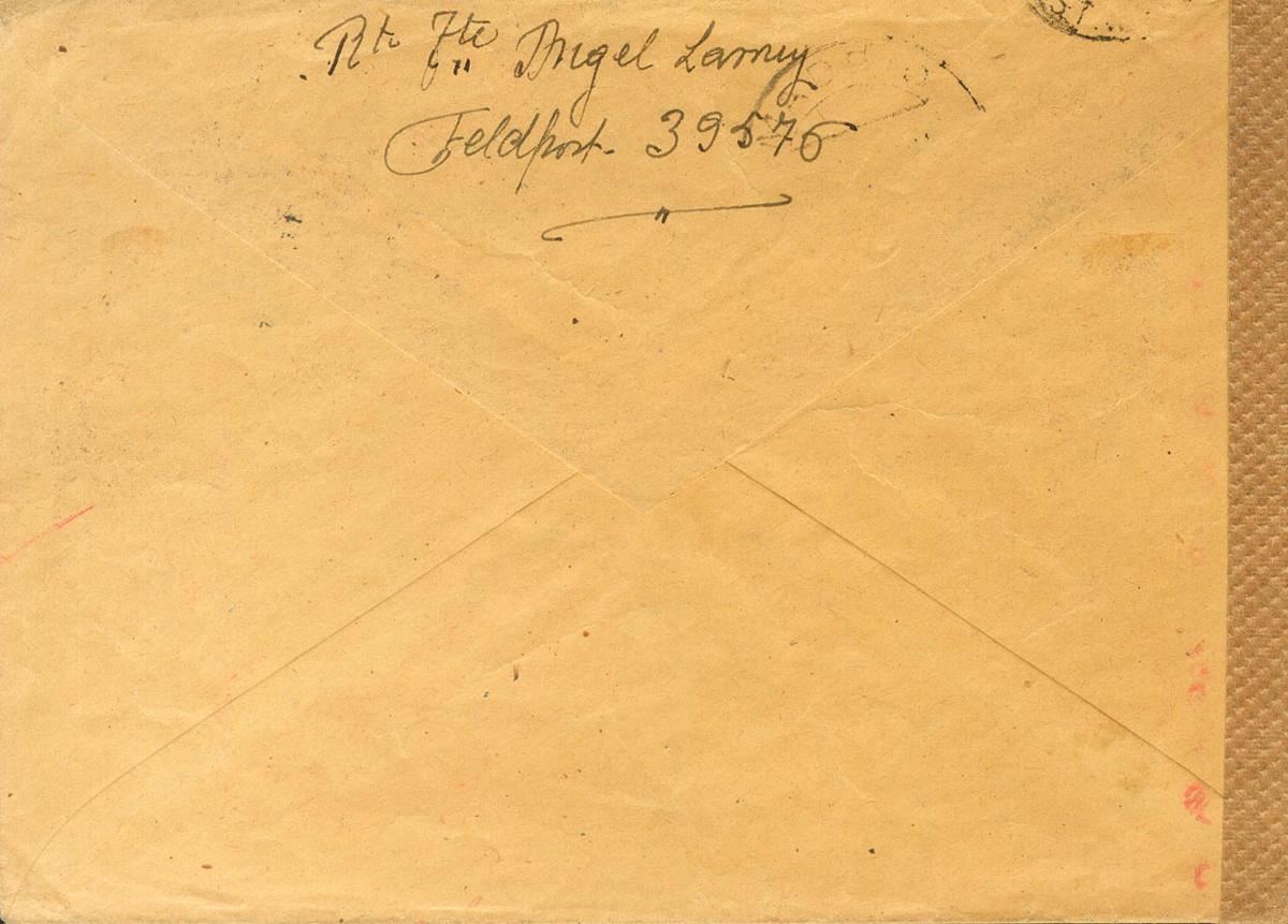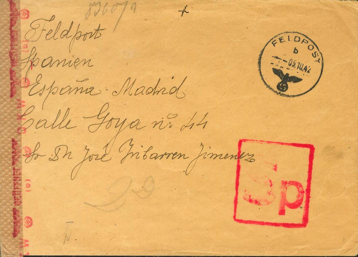 1942. HOSPITALES DE CAMPAÑA (5 de Octubre). FELDPOST Nº39576 (Hospital de Campaña) a MADRID, remitida por Angel Larruy, Capellán Castrense del Hospital de Campaña, muy probablemente para transmitirle el pésame sobre su hijo, el Teniente Iribarren, recientemente fallecido por la explosión de una mina rusa. Fechador FELDPOST / B y marca SP (grande), en rojo. MAGNIFICA Y RARA.