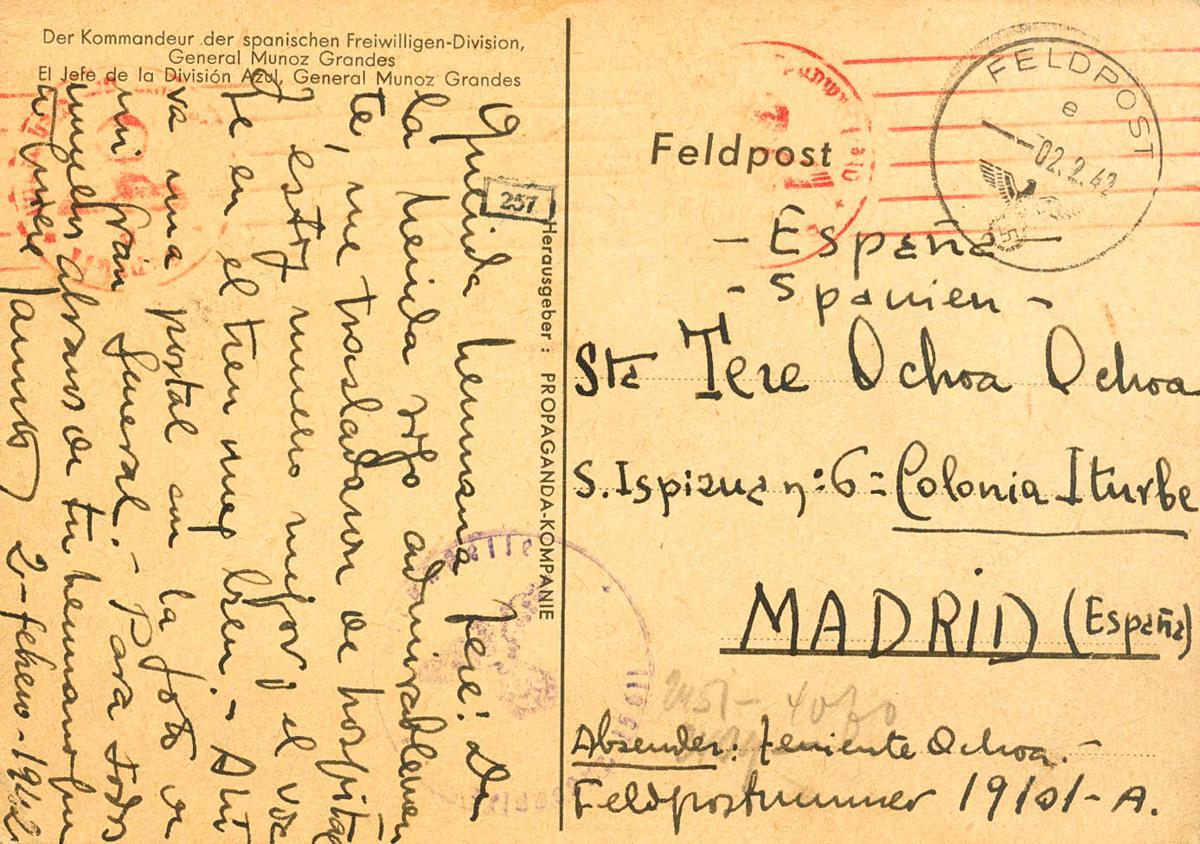 1942. FRENTE DE NOWGOROD-HOSPITAL DE CAMPAÑA (2 de Febrero). Tarjeta Postal FELDPOST Nº19101-A (Regimiento de Infantería 269, 3º Batallón), remitida por un teniente herido indicando en el texto que le trasladan de hospital. Marca FELDPOST Nº15611, en violeta, correspondiente al Hospital de Guerra 551 alemán. MAGNIFICA Y RARA.