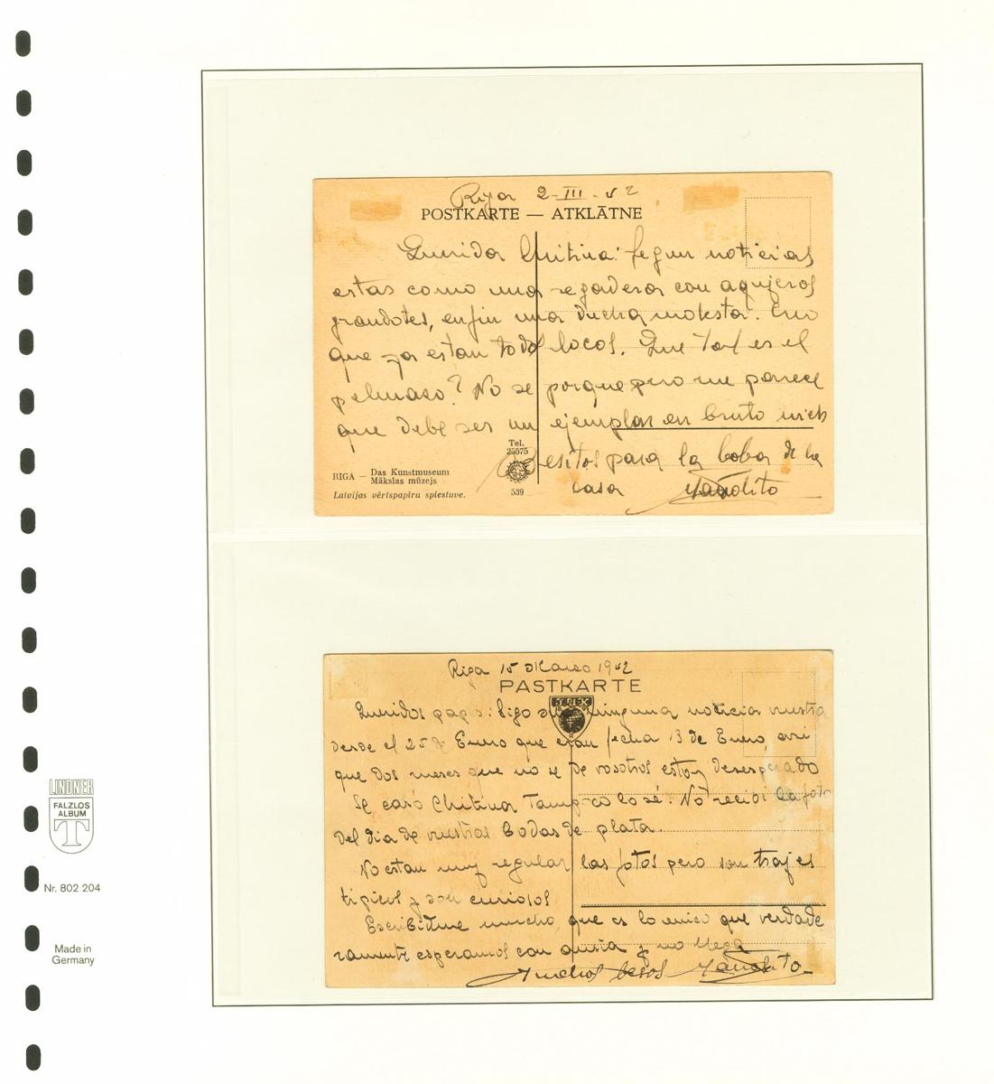 1942. Interesante conjunto de catorce tarjetas postales remitidas desde el Hospital de Riga entre Marzo y Junio de 1942 escritas por un practicante, algunas con anotaciones o números de los censores, todas circuladas dentro de sobre, por lo que carecen de marcas postales o anotaciones identificativas de la División Azul. MAGNIFICAS Y RARO CONJUNTO.